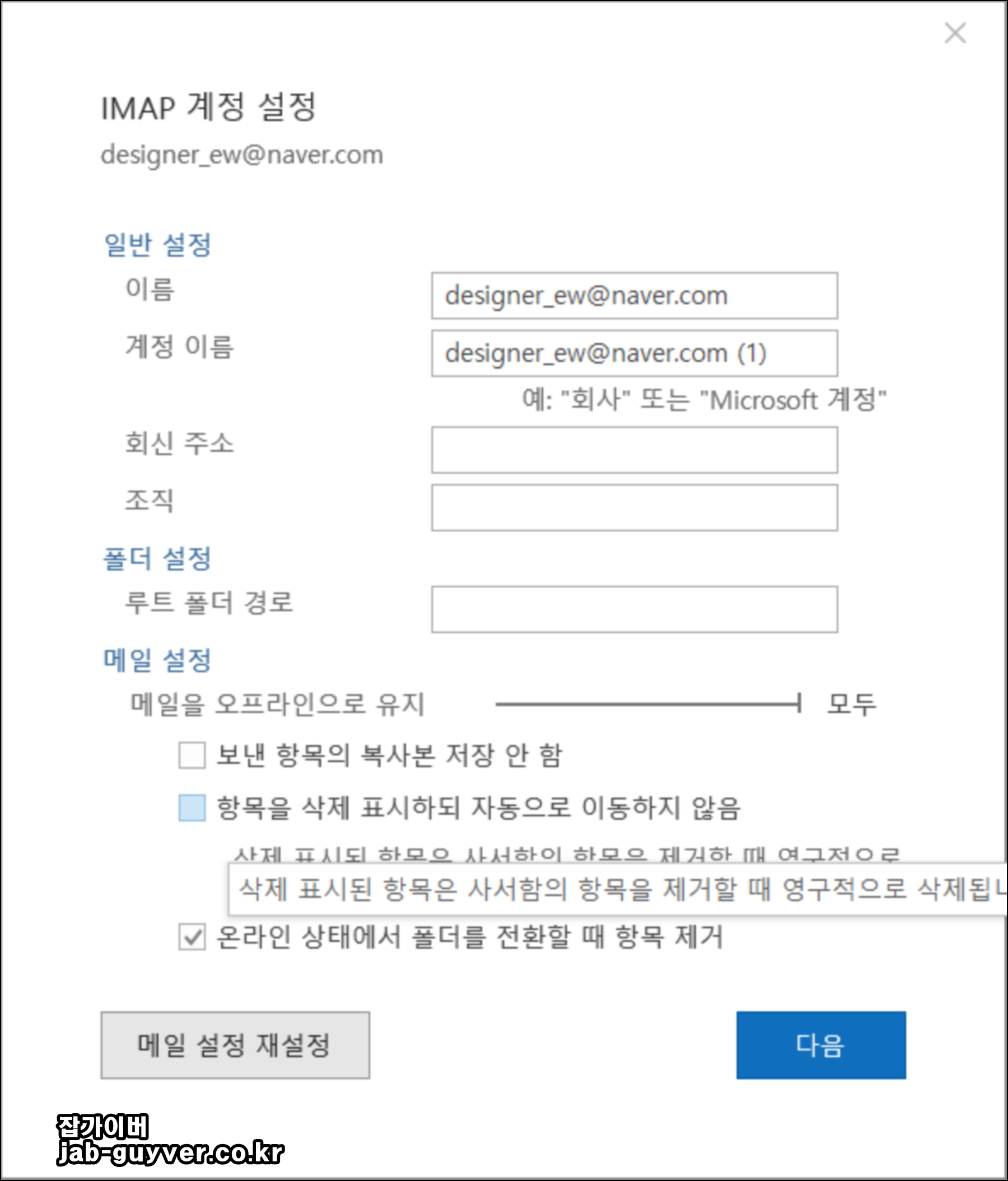 - 설정 경로: 계정 설정 > IMAP 폴더 > 삭제 폴더 수동 설정