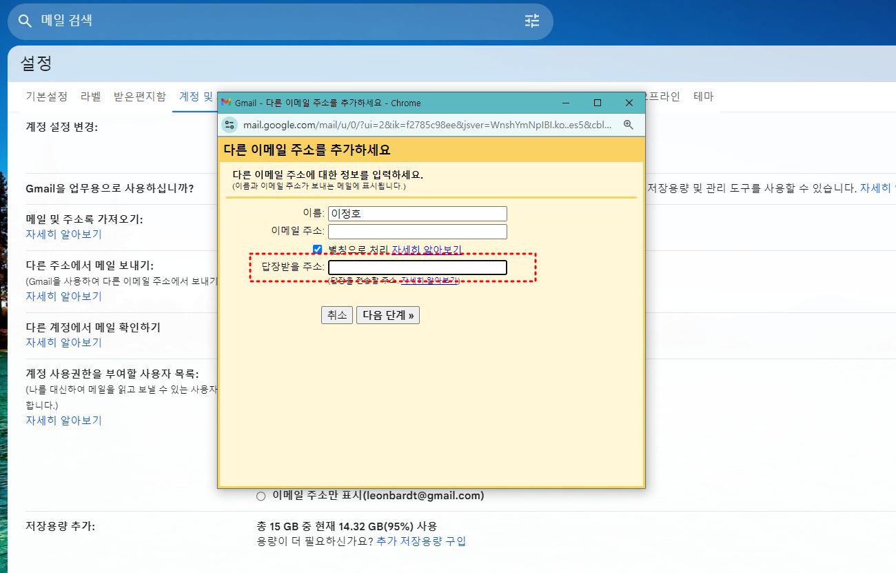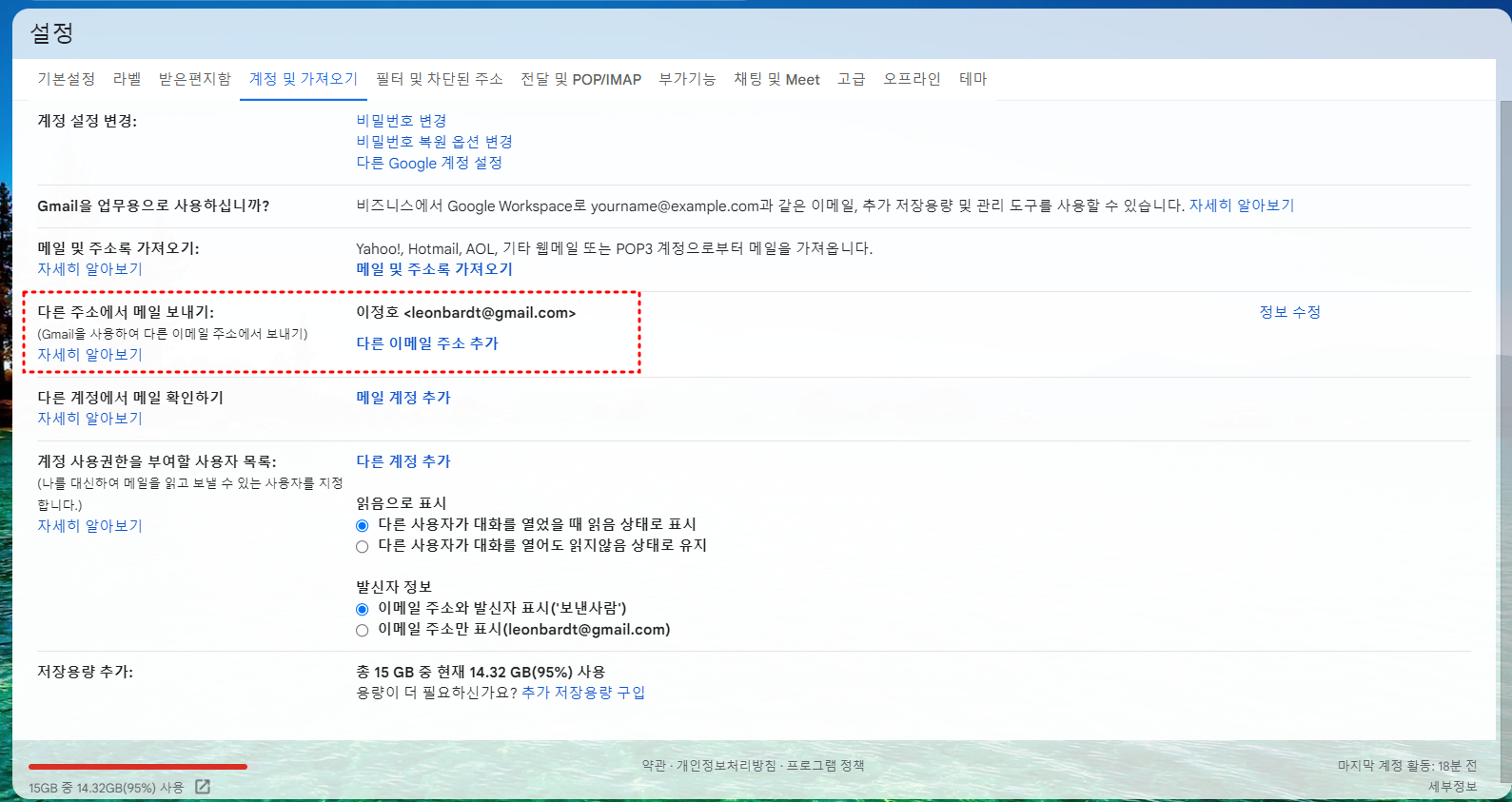 설정 메뉴에서 '계정 및 가져오기' 탭을 클릭 후 '다른 주소에서 메일 보내기' 섹션을 찾습니다. 이곳에서는 새롭게 사용할 이메일 주소를 추가할 수 있습니다.
