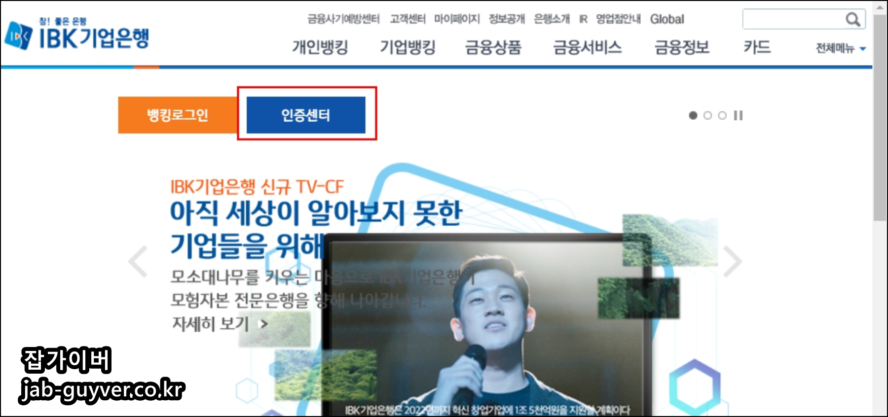 기업은행 메인 화면에서 인증센터 메뉴를 눌러 이동합니다.