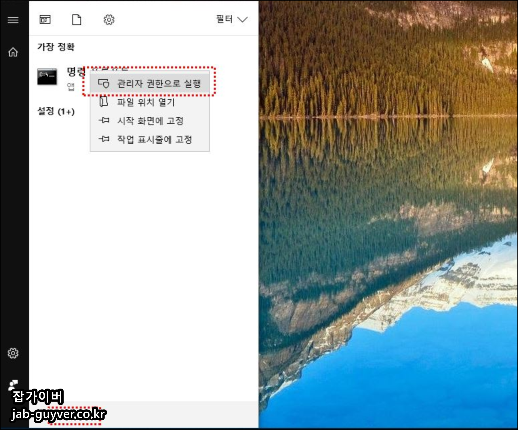 윈도우10 명령프롬포트 or CMD를 검색해서 관리자권한으로 실행합니다.