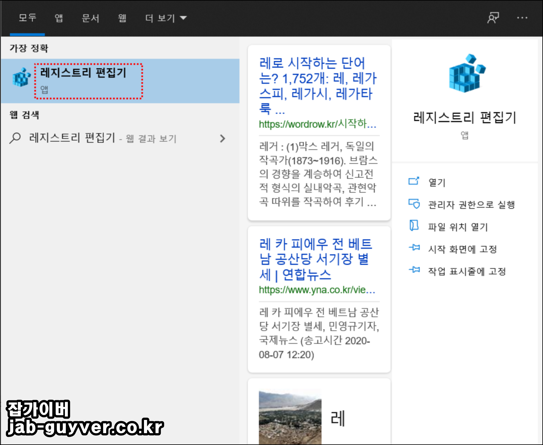윈도우 검색창에 "레지스트리 편집기"를 입력 후 실행합니다.