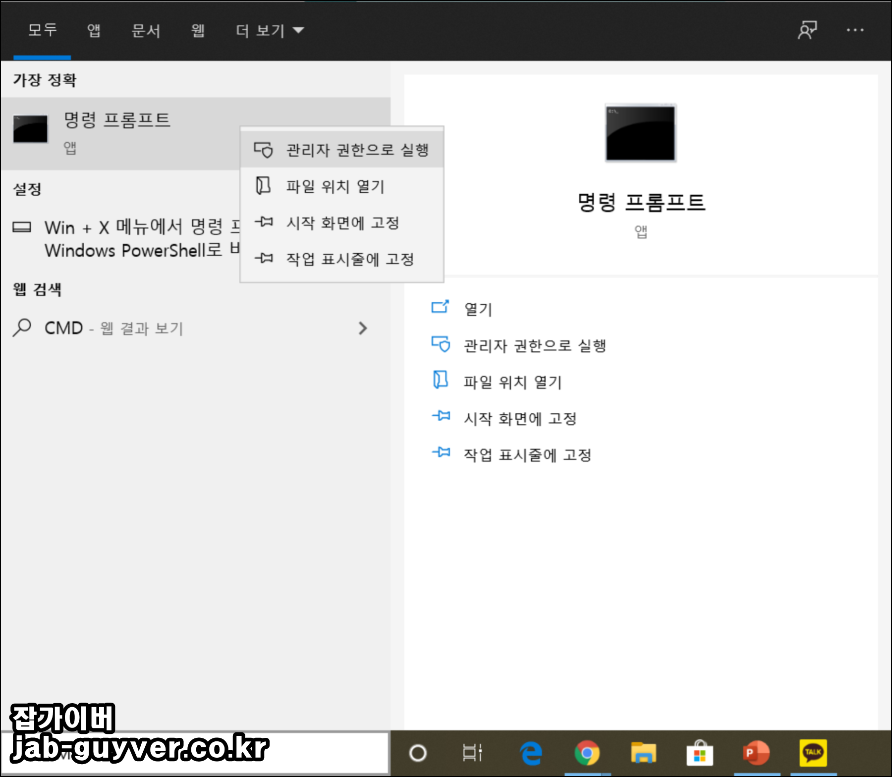 두 번째 CMD 명령프롬프트로 확인하는 방법으로 CMD를 관리자 권한으로 실행합니다.