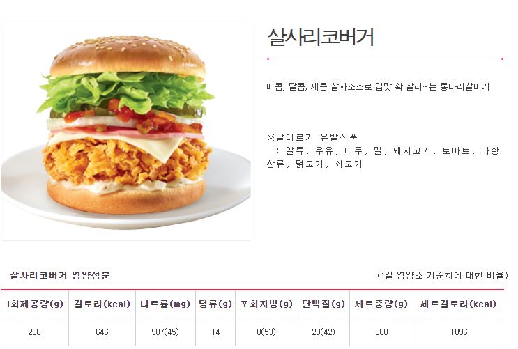 매콤하면서 달콤한 맛을 좋아하는 분들이라면 살사소스가 들어있는 통다리살버거인 살사리코 버거도 추천합니다.