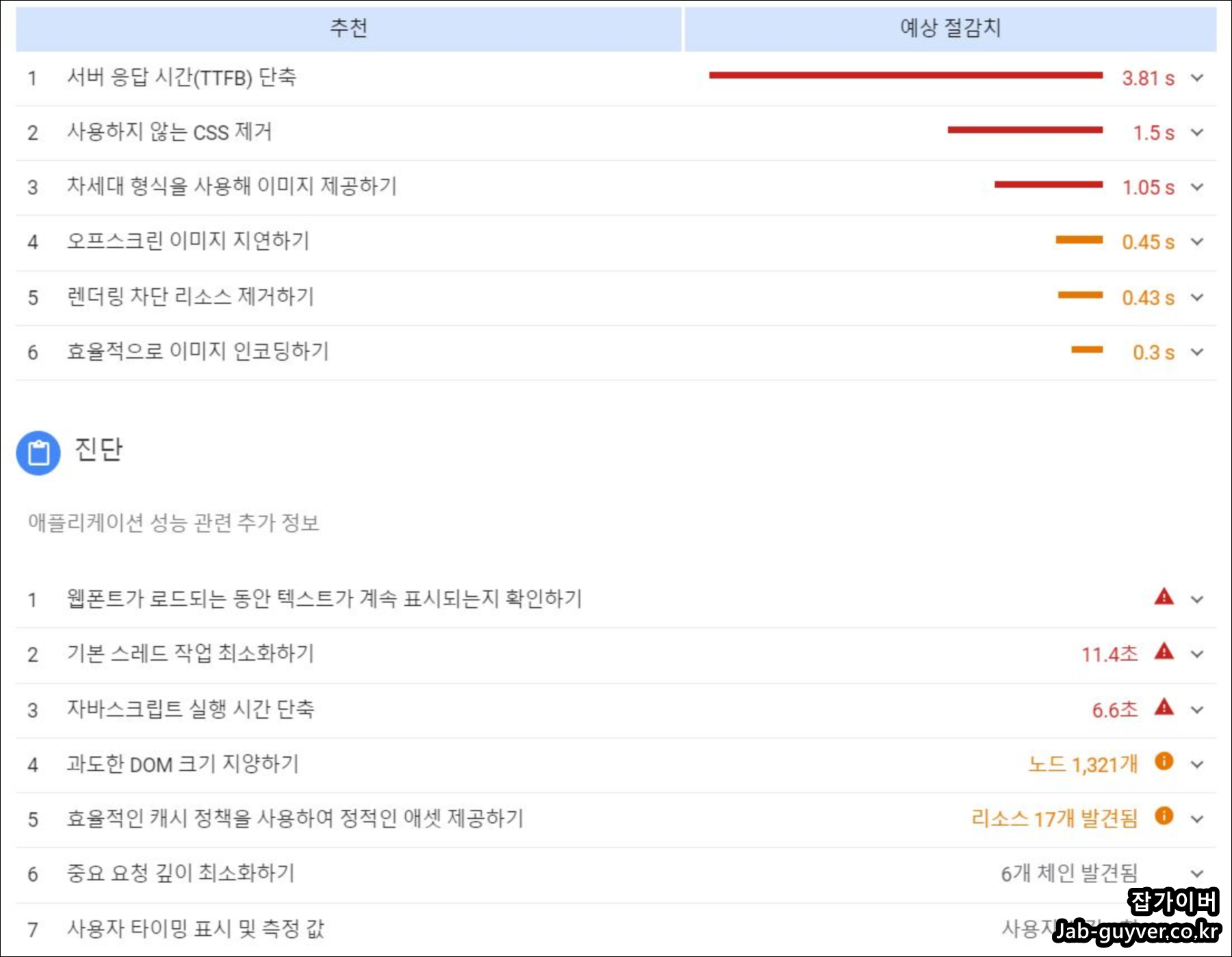 | 자바스크립트 실행 시간 | 필요한 스크립트만 남기고 나머지는 지연 로딩을 적용합니다. |