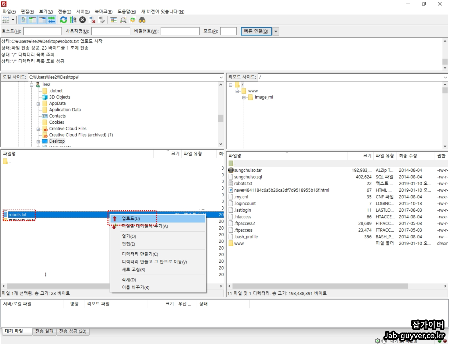 FTP에 접속한 뒤, 로컬 컴퓨터에서 준비한 robots.txt를 드래그해서 워드프레스 최상위 경로에 업로드하면 기본 작업은 끝입니다.