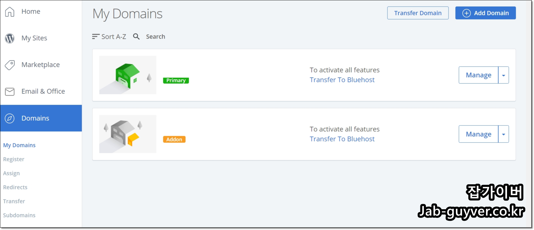 여기까지 설정을 마치면 블루호스트 입장에서는 하나의 계정에 도메인이 두 개 이상 연결된 상태가 됩니다. 실제로 My Domains 메뉴로 들어가 보면 아래처럼 도메인이 2개 이상 표시되는 것을 확인할 수 있습니다.