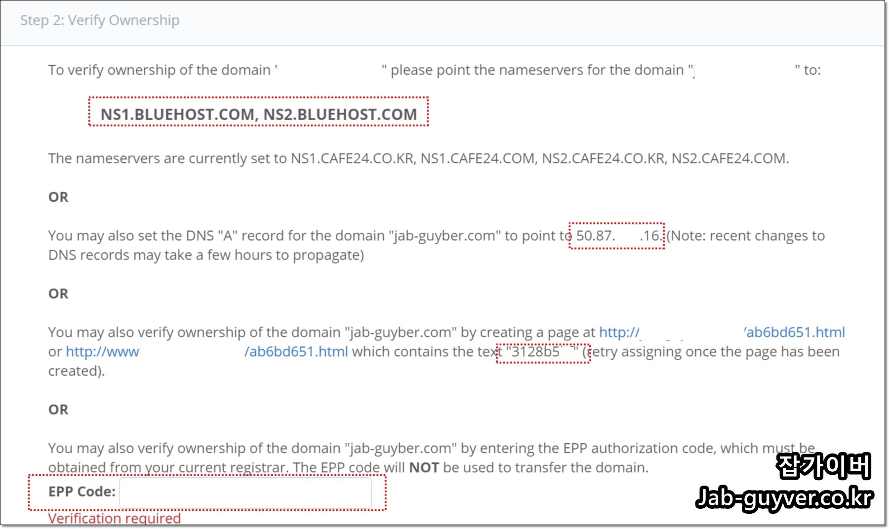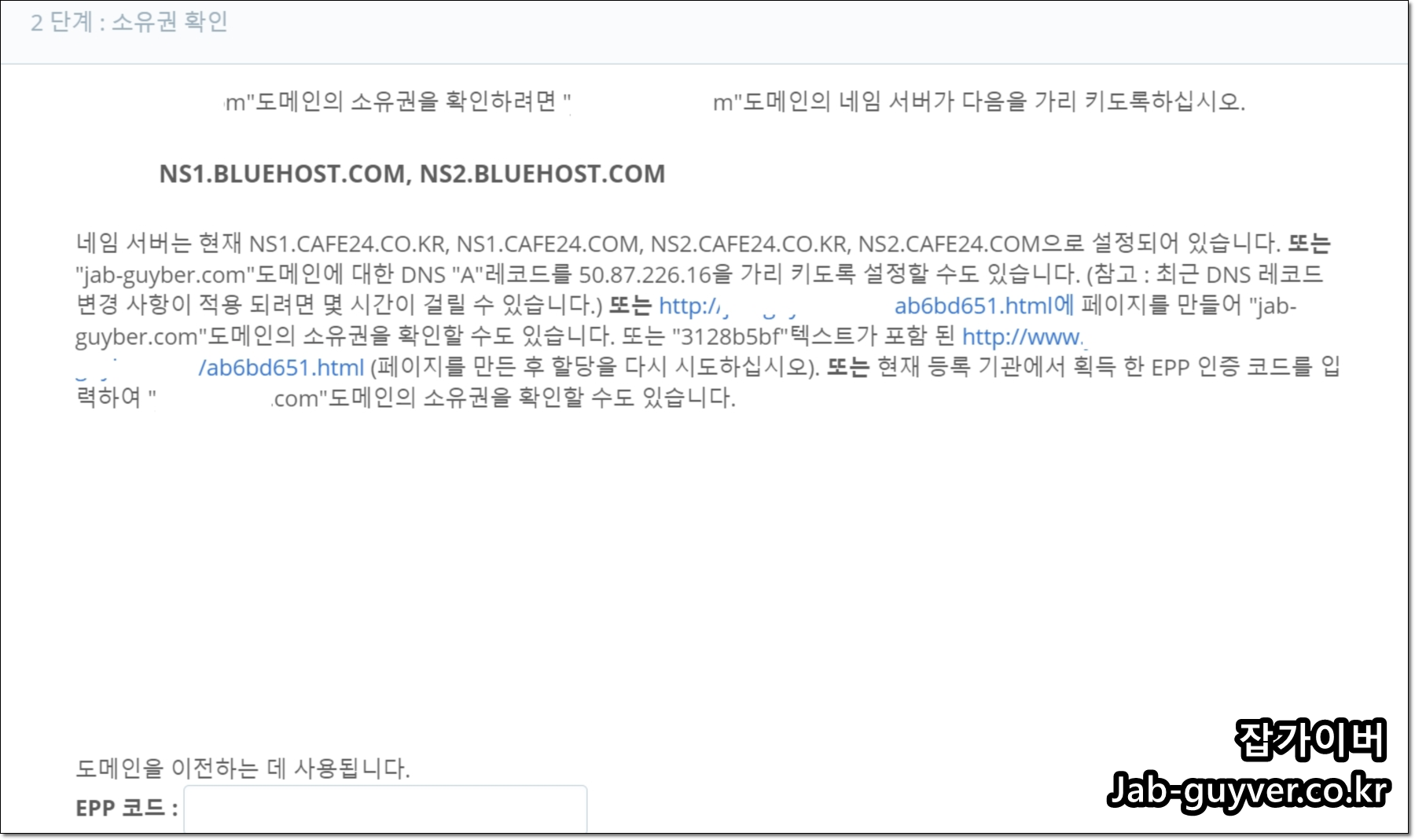 도메인을 이전할 때 사용하는 EPP 코드를 입력해 소유권을 확인하는 방법입니다. 이 경우 도메인을 아예 다른 곳으로 옮기는 흐름과 연결될 수 있으니, 단순 연결이 목적이라면 위의 네임서버 변경이나 A레코드 수정 방식이 더 일반적입니다.