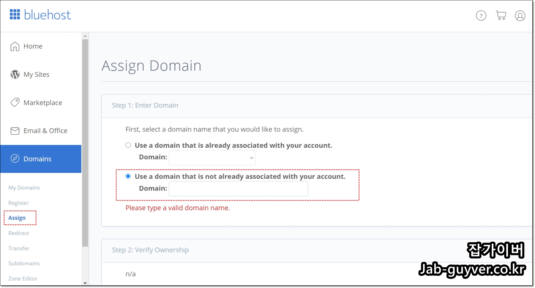 설정이 끝난 뒤 일정 시간이 지나면, 블루호스트 Assign 화면에서 입력했던 도메인의 소유권 확인이 완료됩니다. 새로고침했을 때 Ownership verified 같은 문구가 보인다면 정상적으로 연결된 것입니다.