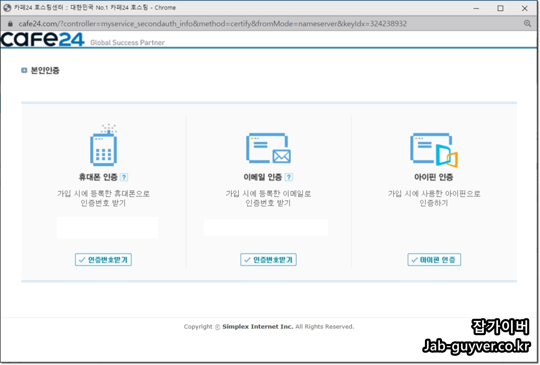 네임서버 변경을 요청하면 카페24에서 본인 인증을 한 번 거치게 됩니다. 통신사 인증이나 공동인증서를 사용하는 일반적인 인증 절차라, 화면에 안내되는 대로 진행하면 됩니다.