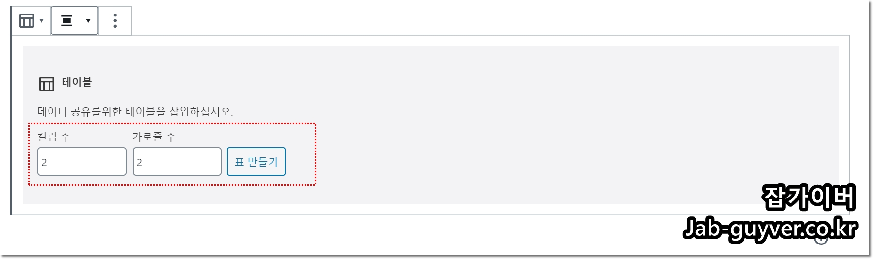 테이블 블록을 선택하면 아래처럼 열과 행 개수를 먼저 지정하는 화면이 뜹니다.