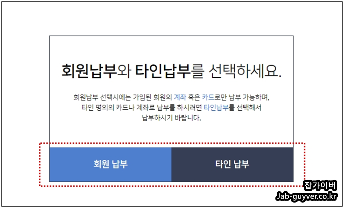 지방세는 회원본인 납부 및 타인납부가 가능하며 본인 외 다른 계좌나 카드로 결제하기 원한다면 타인납부를 선택해야합니다.
