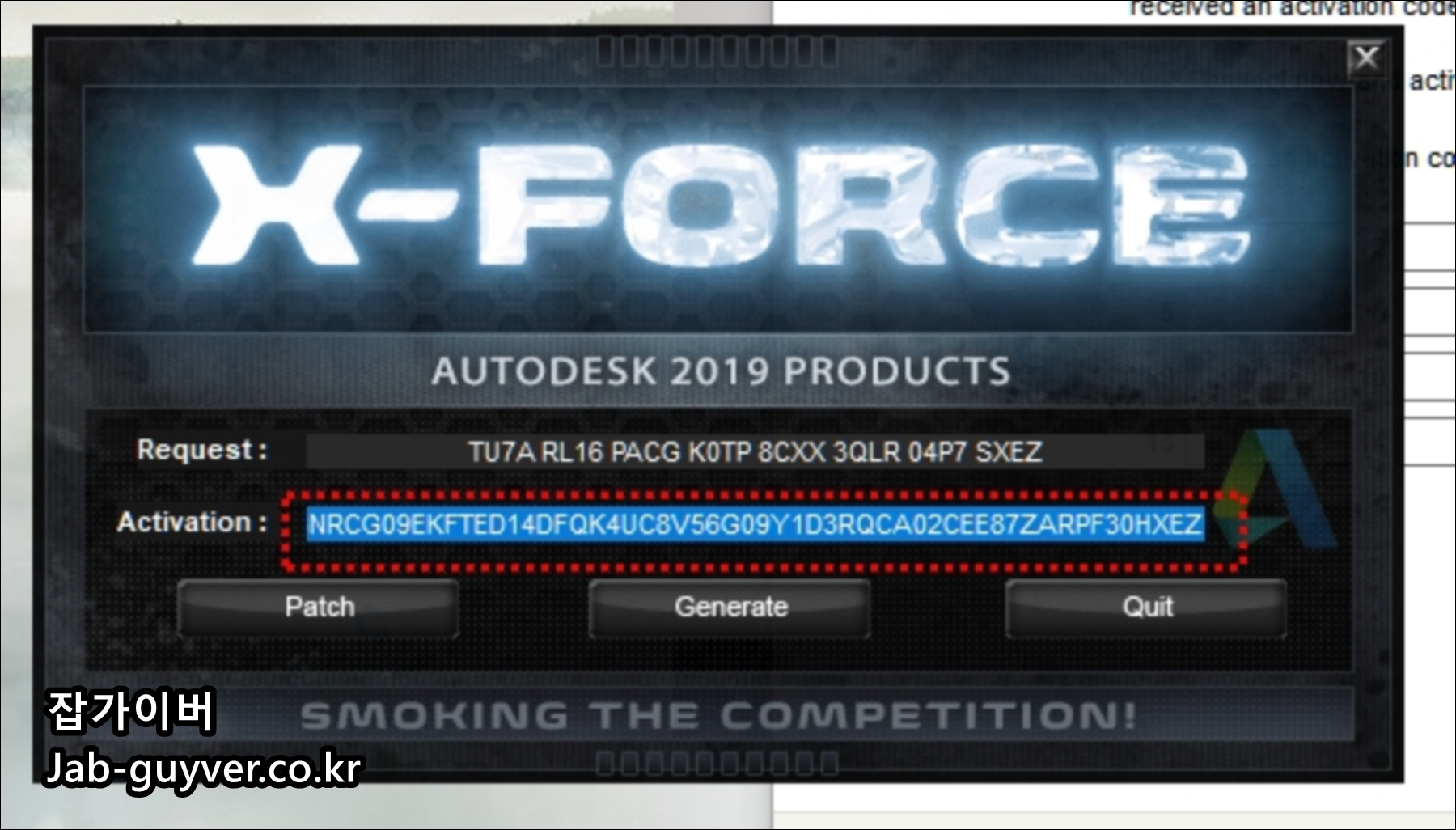 오토캐드에서 보여주는 Request Code를 크랙에 붙여넣기 한 다음 Patch를 눌러줍니다.