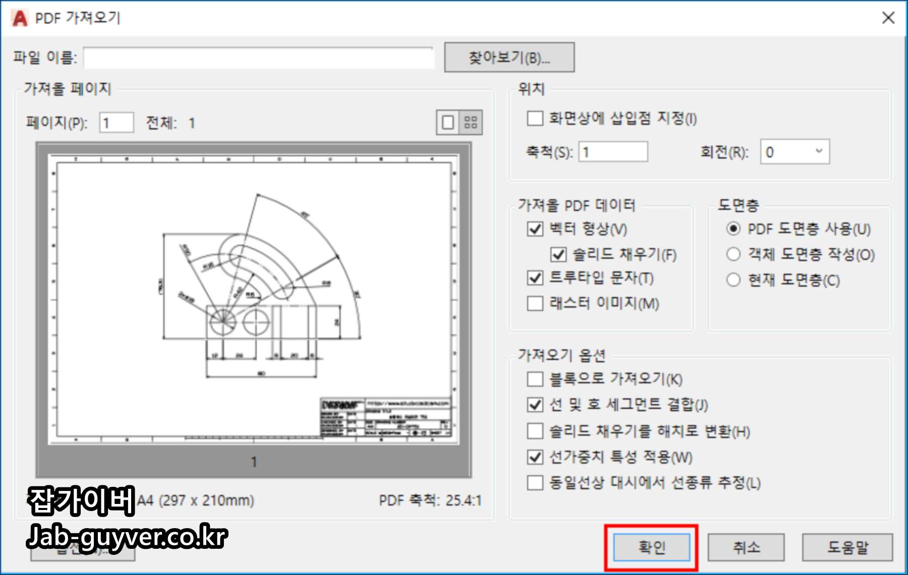 이 부분에서는 너무 복잡하게 생각할 필요는 없습니다. 처음에는 기본값으로 불러온 뒤, 들어온 결과를 보고 위치와 크기를 다시 맞추는 편이 더 편할 때도 많습니다. 도면 축척이 중요한 파일이라면 불러온 뒤 실제 기준 치수를 재서 스케일이 맞는지 꼭 확인해두는 것이 좋습니다.