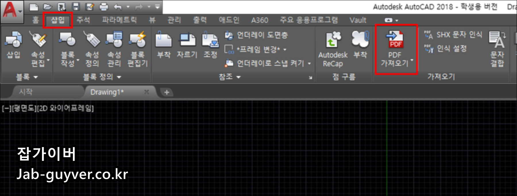 이제 오토캐드를 실행합니다. 리본 메뉴 기준으로는 삽입 → PDF 가져오기를 선택하면 됩니다.