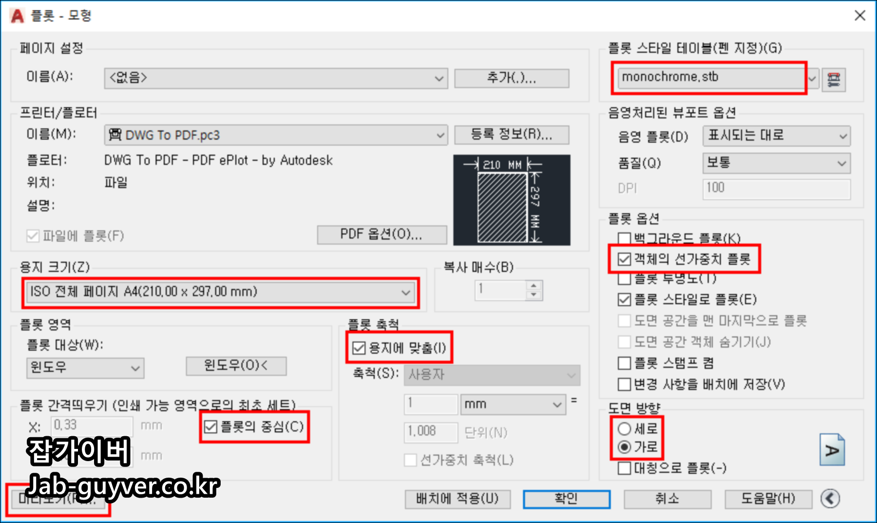 - 플롯 축척은 보통 용지에 맞춤으로 두면 빠르게 결과를 보기 좋습니다.