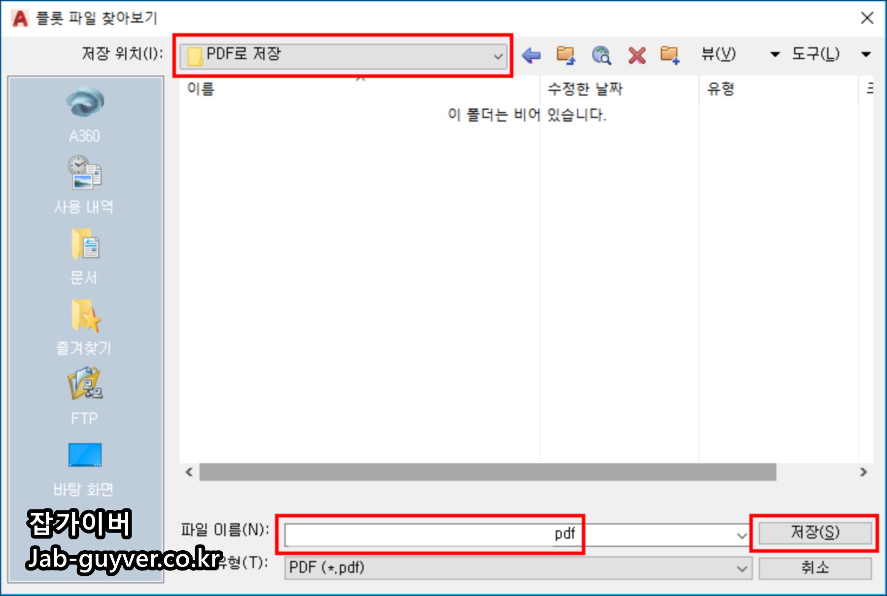 설정 확인이 끝났다면 저장을 진행합니다. 이렇게 하면 DWG나 DXF 도면을 PDF 파일로 깔끔하게 보관하거나 전달할 수 있습니다.