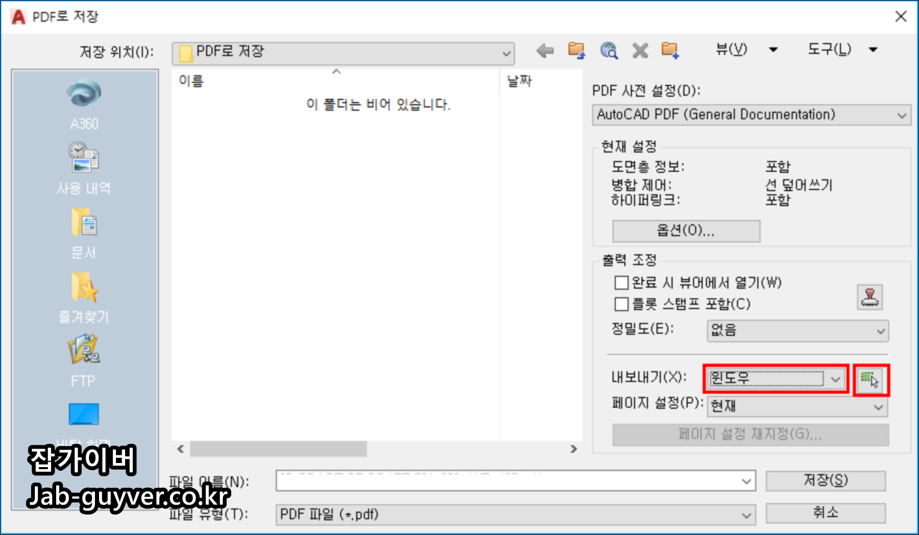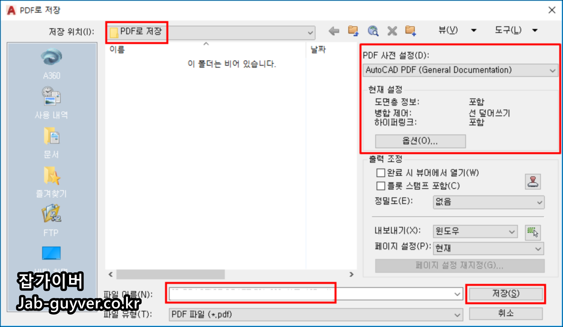 PDF 사전 설정에서는 AutoCAD PDF (General Documentation)을 선택한 뒤 파일 이름을 지정하고 저장하면 됩니다.