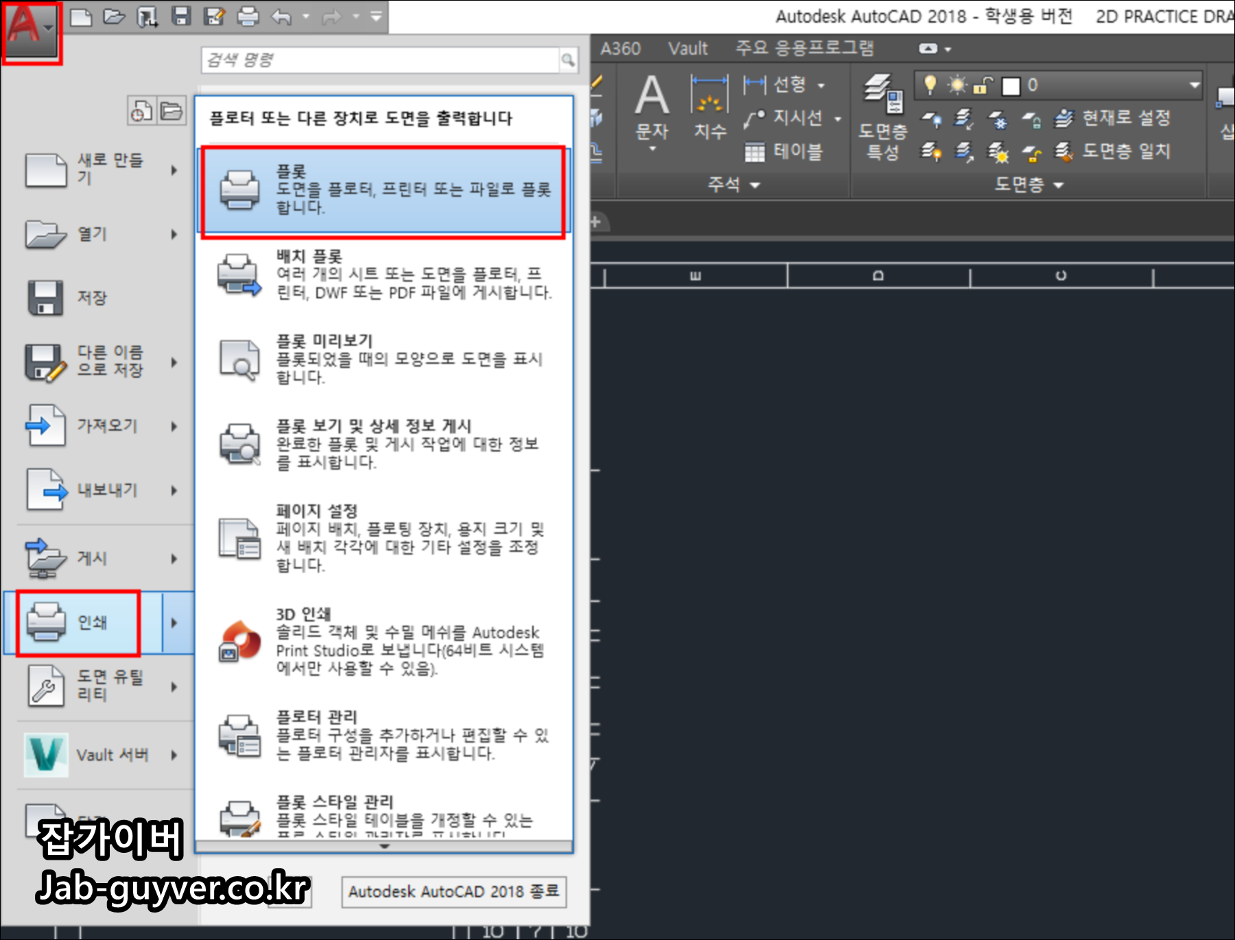 상단 메뉴에서 메뉴 → 인쇄 → 플롯으로 들어갑니다.