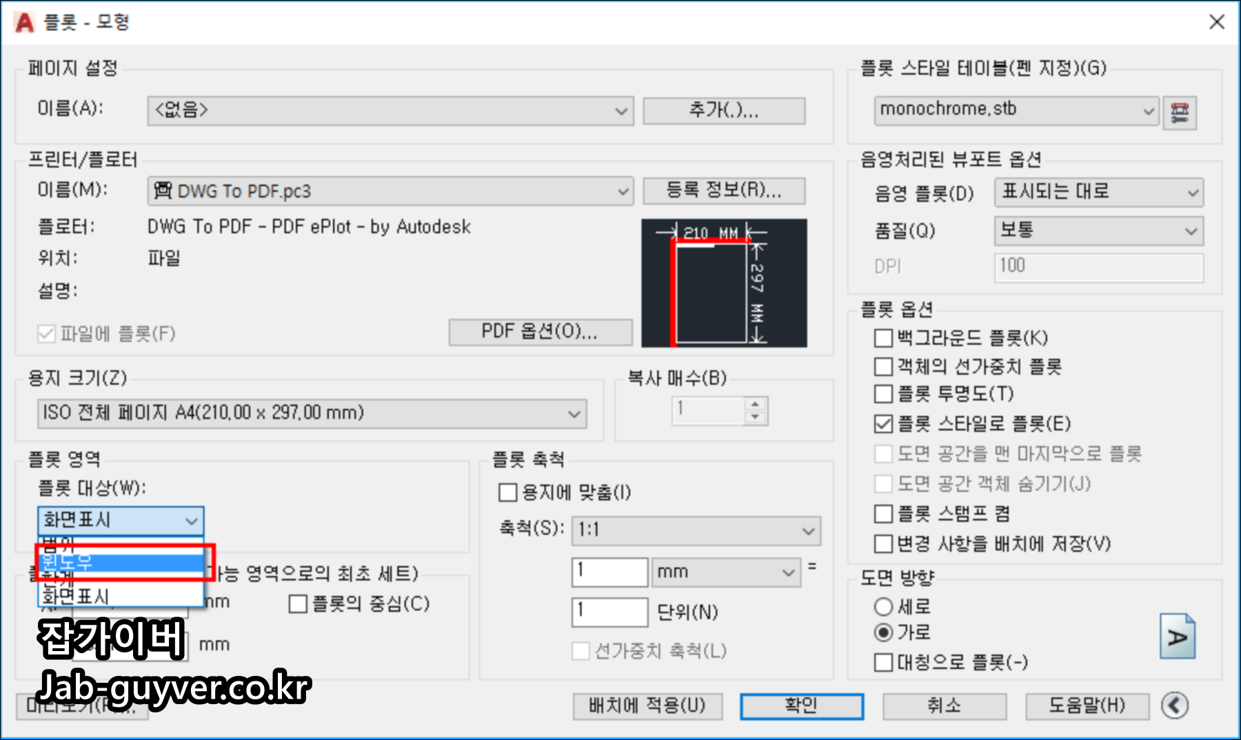 프린터/플로터 항목에서는 DWG To PDF pc3를 선택합니다.