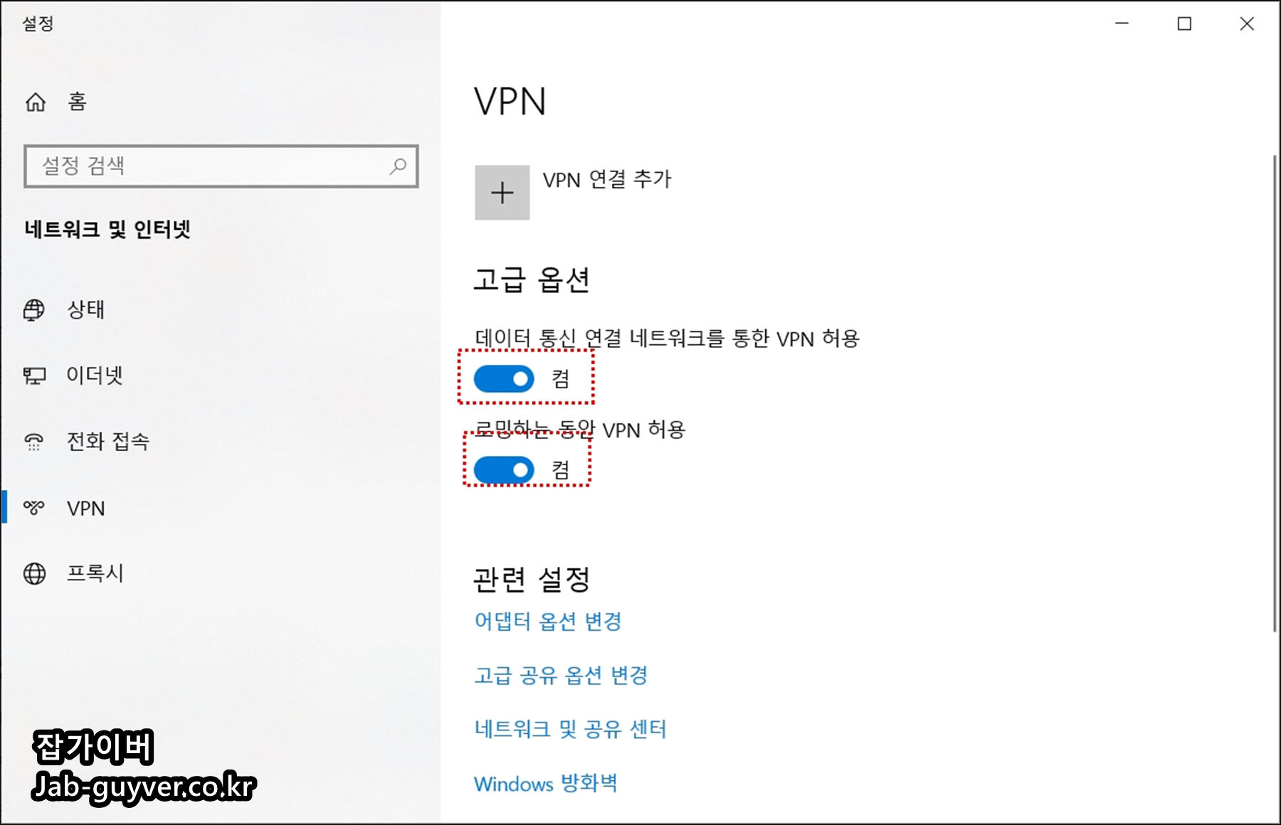 윈도우 설정에서 VPN 가상서버를 통한 인터넷 접속을 하지 않도록 비활성화합니다.