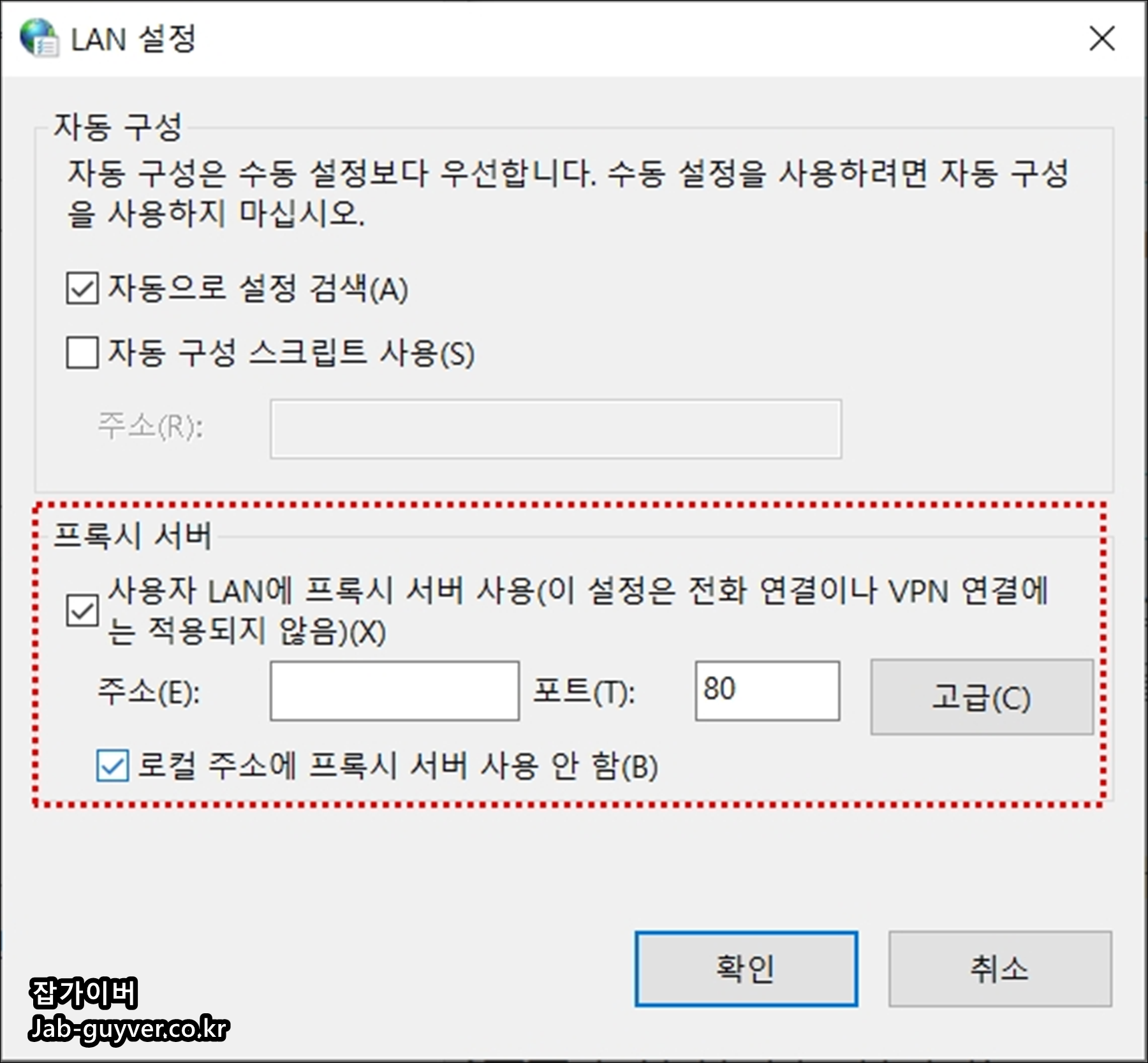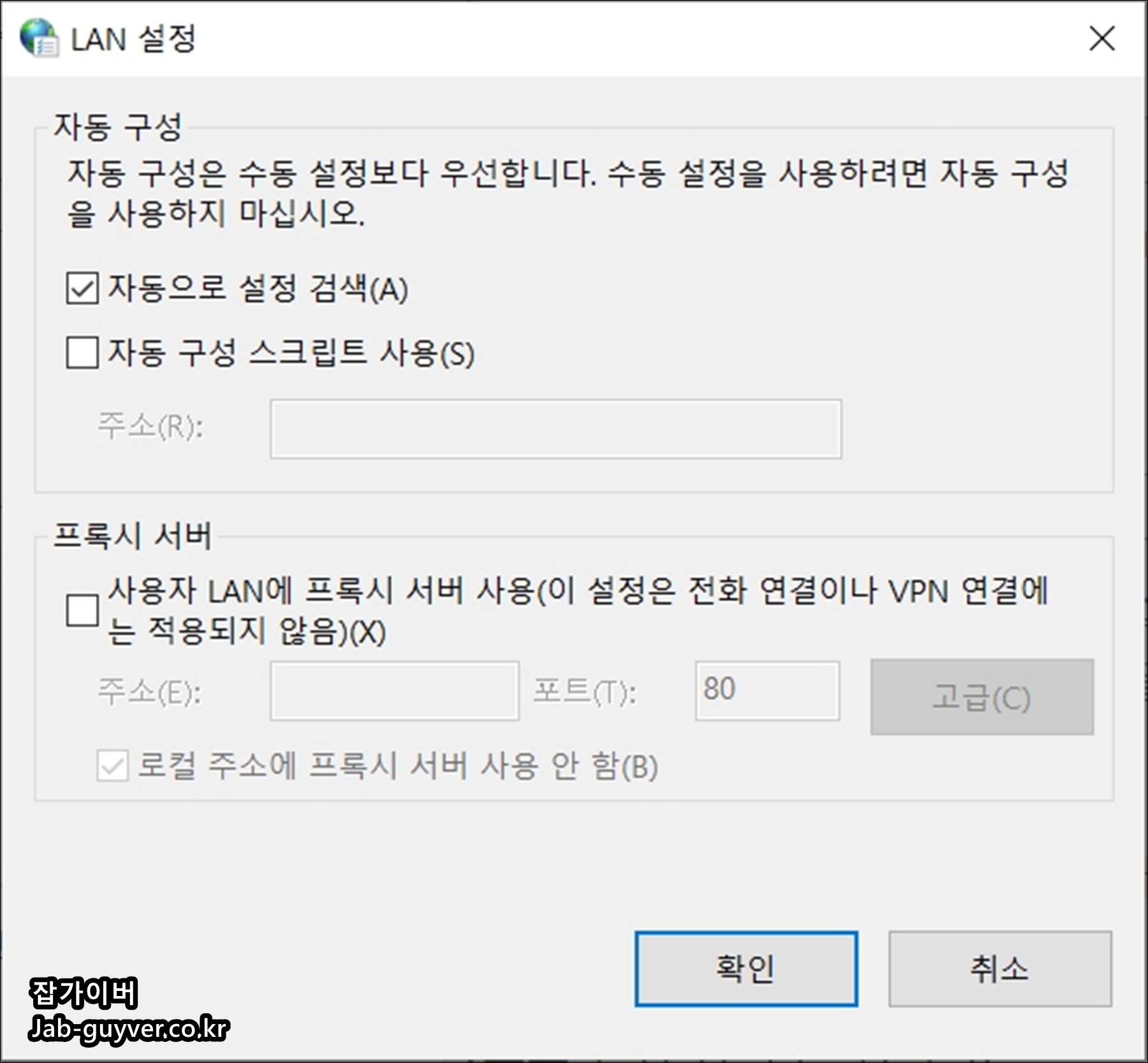 그리고 인터넷 속성 -> 연결 -> Lan 설정에서 프록시 서버를 "사용자가 LAN에 프록시 서버 사용"을 체크 해제해서 비활성화합니다.