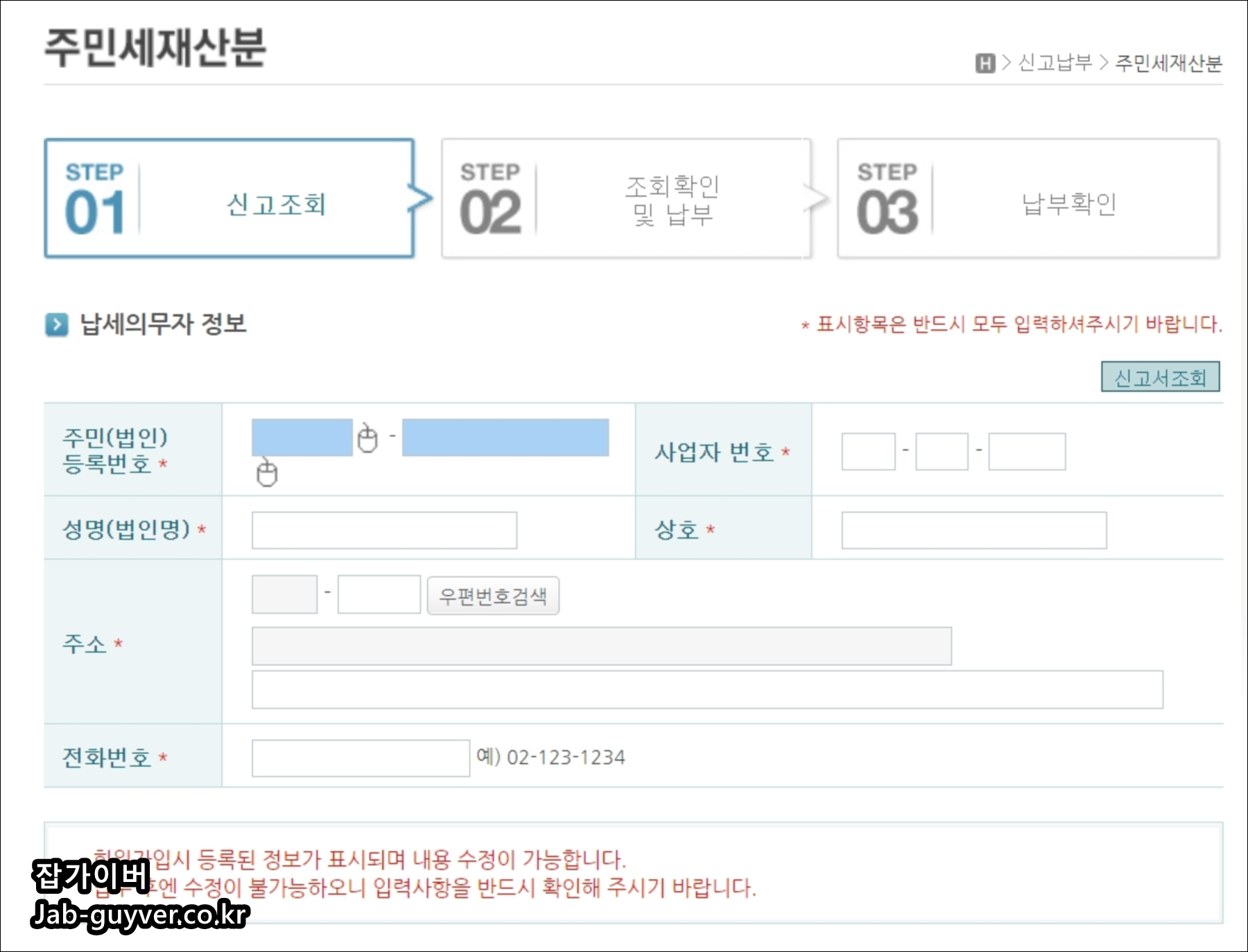 주민 납세의무자 정보로 주민번호 및 사업자번호, 성명(법인명) 상호, 주소, 전화번호 등을 입력합니다.