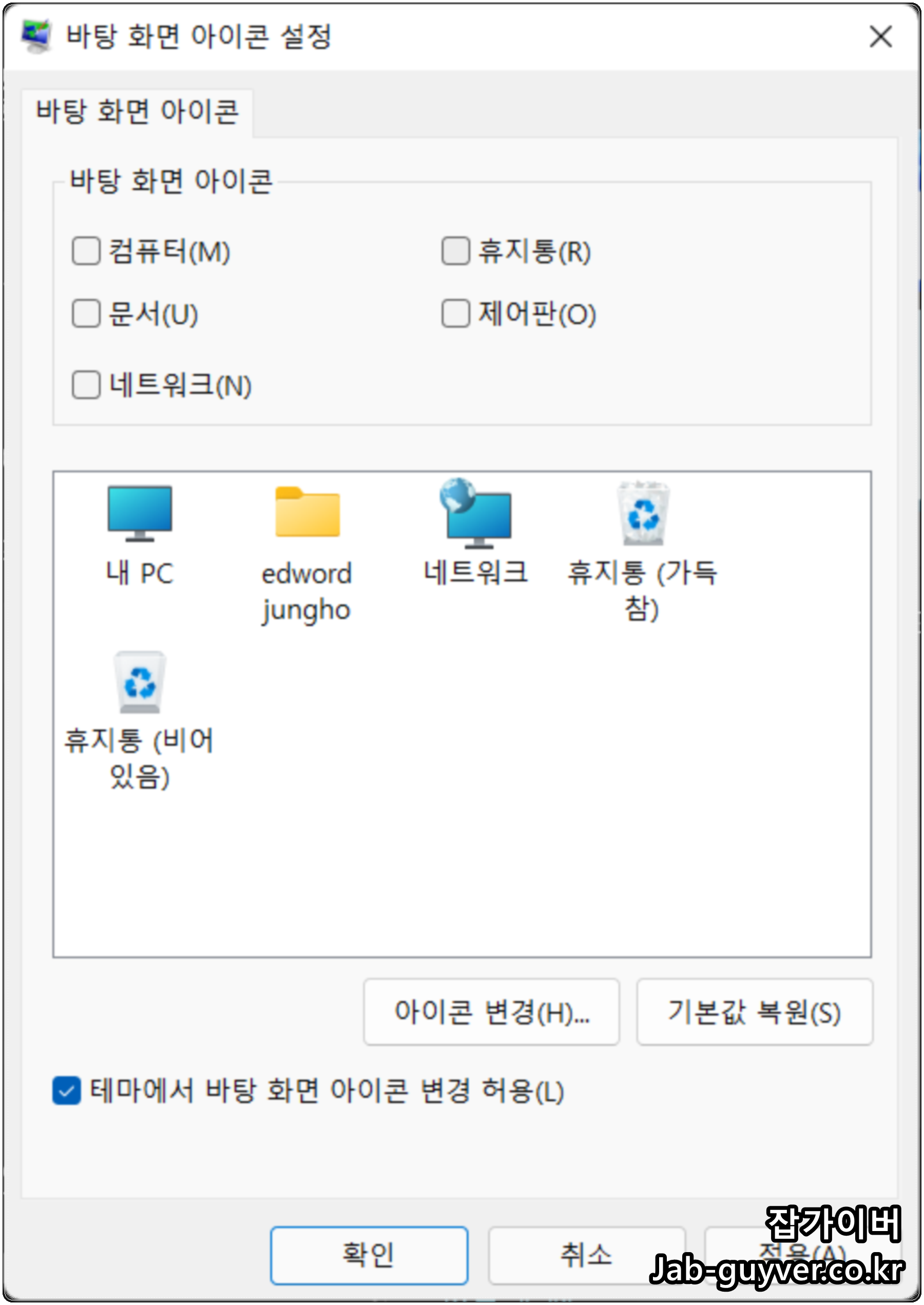 여기서 체크를 끄면 바탕화면에서 바로 숨겨진다. 반대로 다시 보이게 하고 싶으면 체크만 다시 켜면 된다.