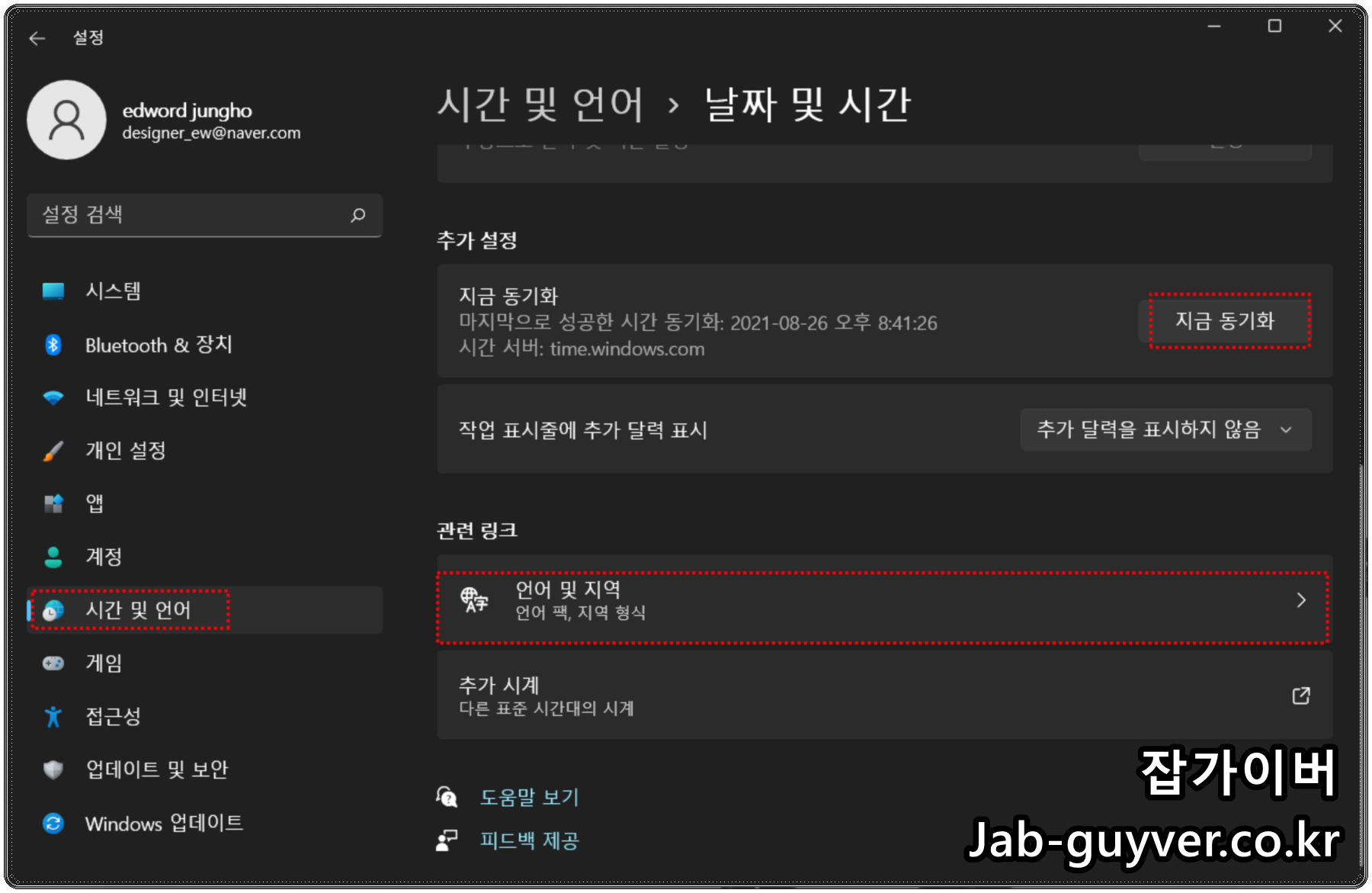 윈도우11 시간 날짜 오류 해결 동기화 안됨·시간대·국가/언어 설정