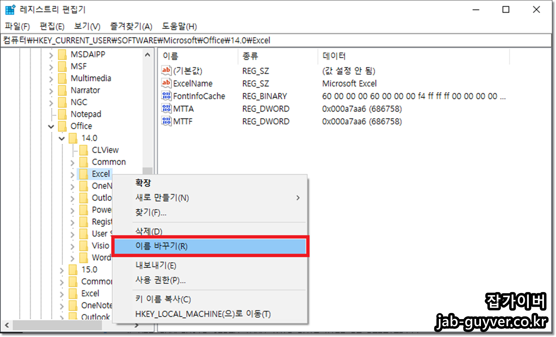네. 엑셀만 초기화하고 싶을 경우, 레지스트리 편집기에서 Office > XX.X > Excel 폴더만 삭제하면 됩니다.