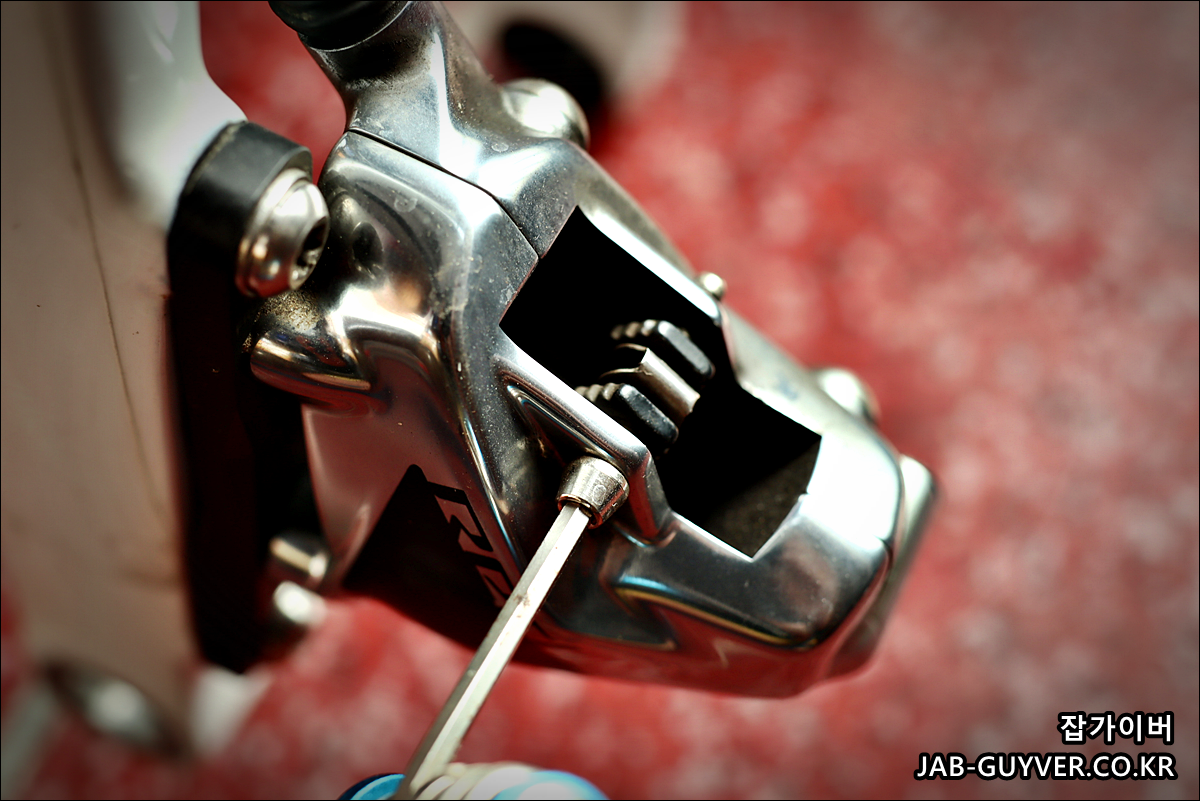 디스크브레이크 교체 시 브레이크 패드가 센터에 위치해 있지 않거나 아니면 디스크 브레이크 피스톤이 제대로 들어가거나 나오지 않느다면 피스톤 사이에 이물질이 꼇을경우로 이 경우 면봉을 이용해 알콜등을 묻혀 피스톤을 조금 나오게 한 다음 피스톤 사이드의 먼지를 제거합니다.