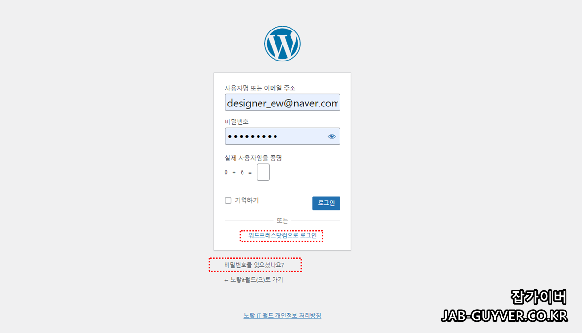 워드프레스 계정으로 로그인시에는 워드프레스 설치시 사용한 사용자명이나 이메일주소와 함게 비밀번호를 입력합니다.