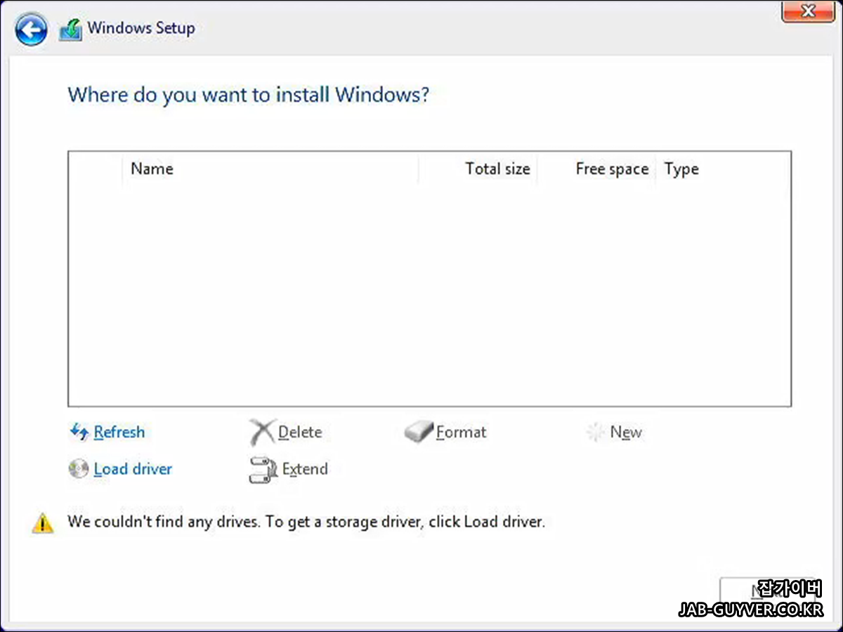 만약 윈도우 설시시에 설치할 디바이스 "하드디스크, 외장하드, SSD"등등이 인식이 되지 않을 수 있습니다.