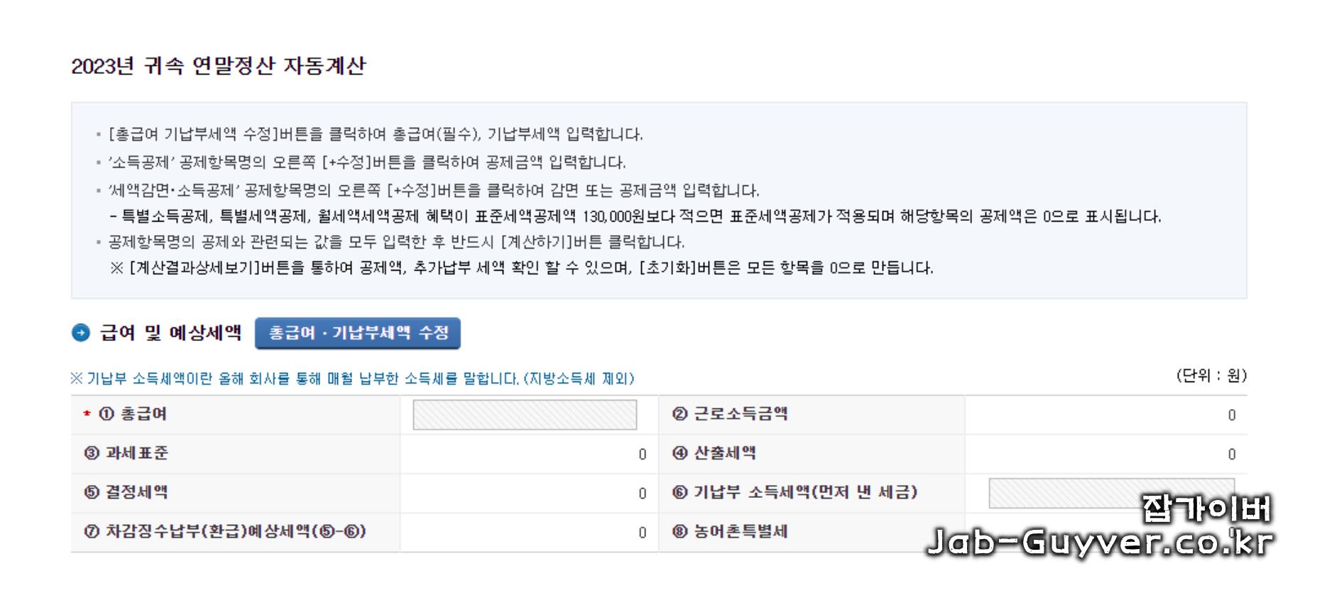 이제 연도를 선택하고 자신의 총급여와 기납부세액을 입력하여 세금을 자동으로 계산할 수 있습니다.