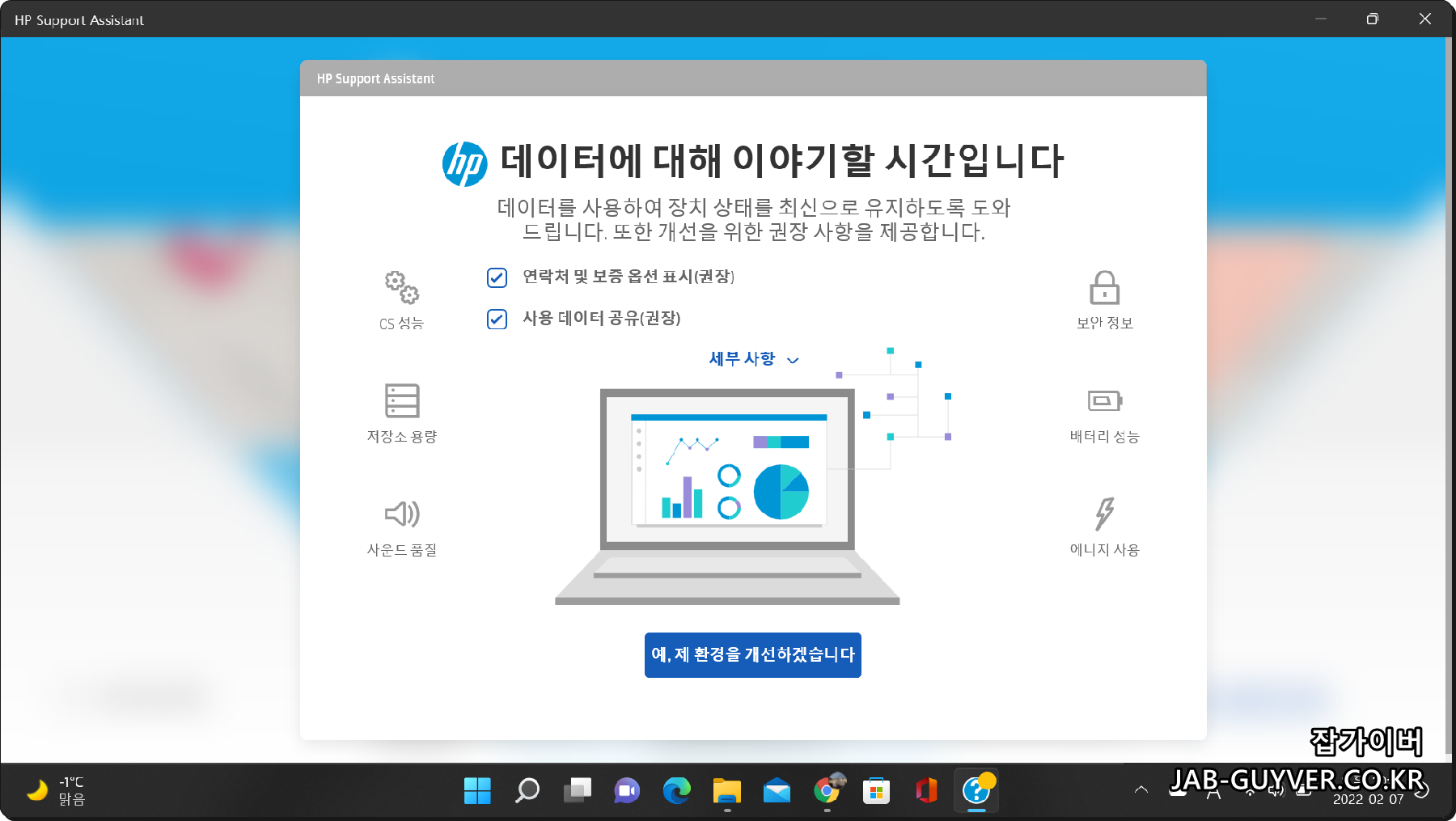 처음 실행할 때 뜨는 데이터 동기화 동의 화면은 제품 정보와 진단 결과를 HP 계정에 연동할지 여부를 묻는 부분이라서, 특별히 꺼릴 이유가 없다면 동의해 두는 편이 관리 측면에서 편합니다.