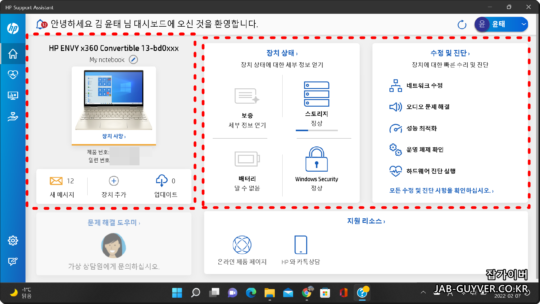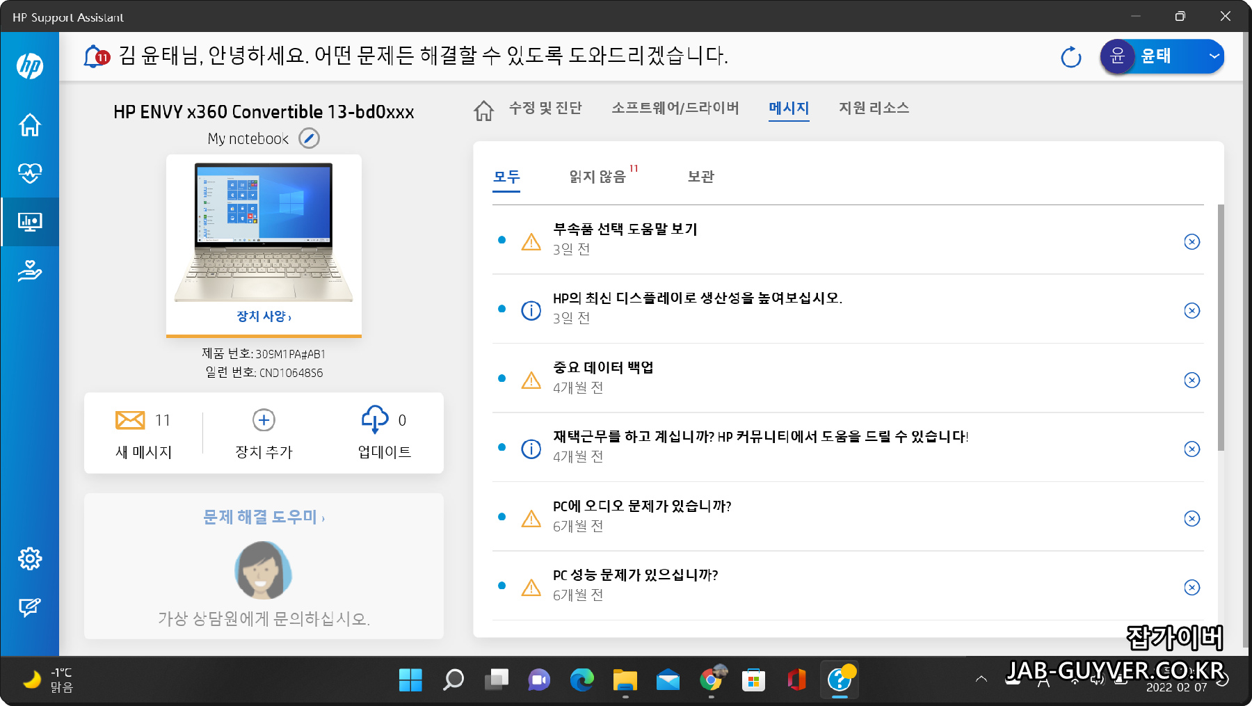 HP Support Assistant를 실행하면 이 노트북이 어떤 모델인지, 펌웨어와 드라이버는 최신인지, 배터리와 저장장치 상태는 어떤지 한 번에 정리됩니다.