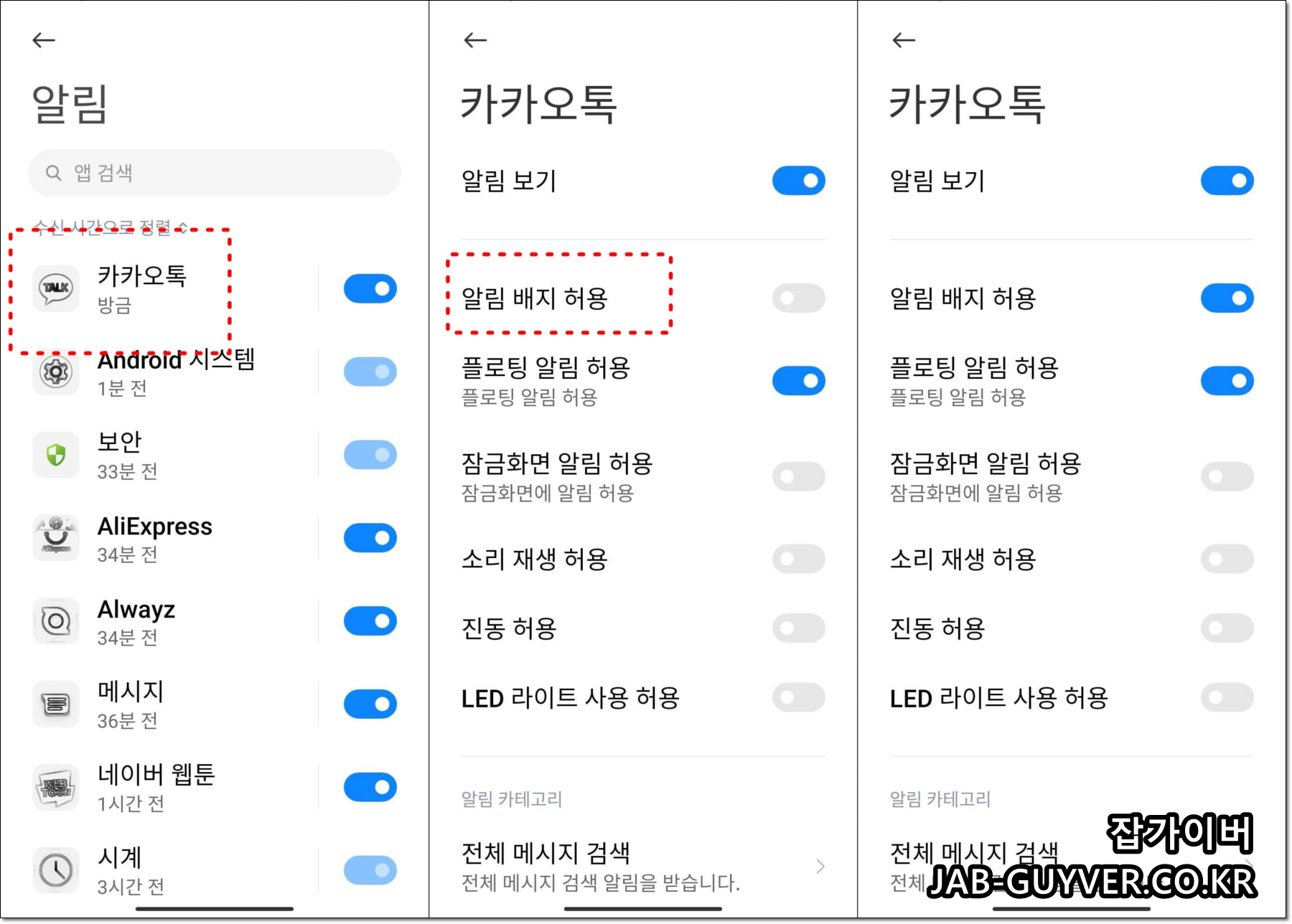 샤오미처럼 MIUI를 쓰는 폰이 아니라도 기본 개념은 같다. 다만 갤럭시와 아이폰은 이름과 진입 위치가 조금 다르기 때문에 자주 헷갈린다. 카카오톡 숫자알림 표시만 놓고 보면 이렇게 생각해두면 편하다.