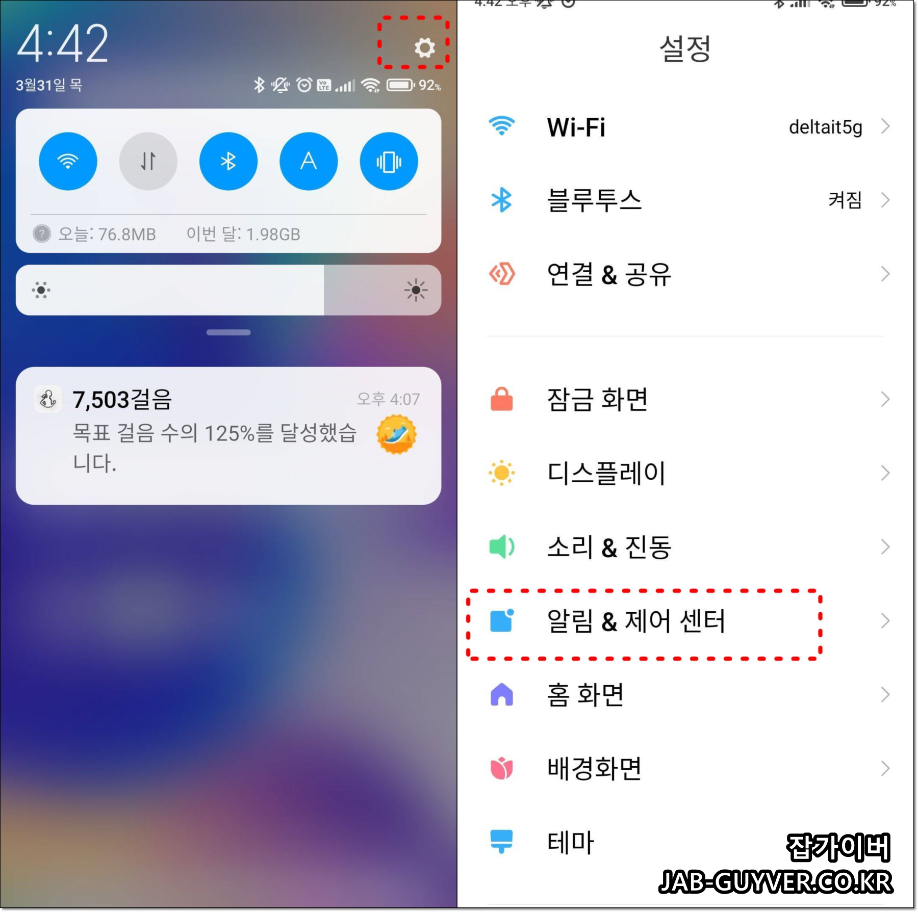 예시 화면은 샤오미 홍미노트9S (MIUI) 기준이지만, 갤럭시·안드로이드 폰 대부분이 비슷한 구조라 용어만 조금 다를 뿐 흐름은 거의 같다. 먼저 휴대폰의 기본 설정을 연 뒤 알림 & 제어센터 또는 “알림” 메뉴를 찾는다. 갤럭시는 “알림” 또는 “알림 배지 설정”처럼 이름이 붙어 있는 경우가 많다.