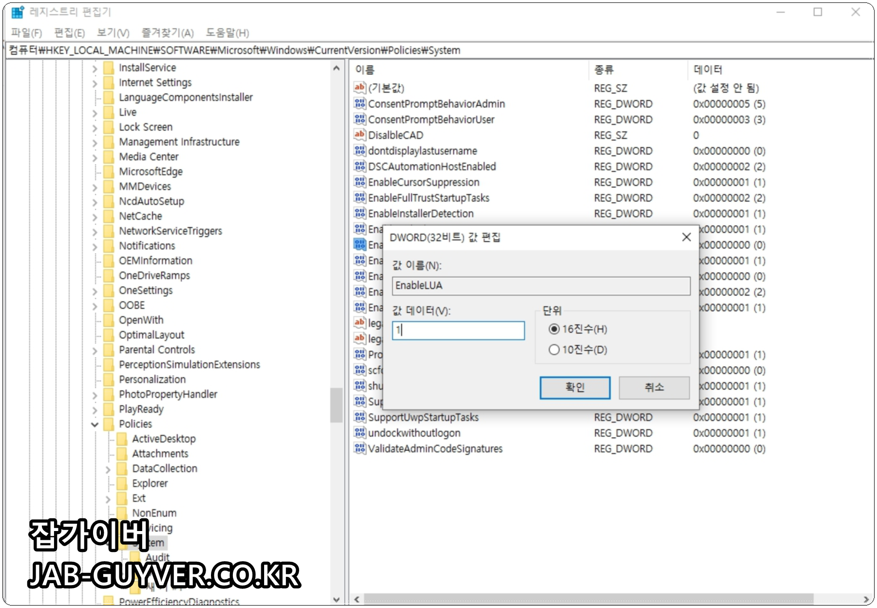 'EnableLUA'을 찾아 더블클릭하고 DWORD(32비트) 값을 1에서 0으로 변경하고 확인을 눌러 사용자 계정 컨트롤 알림을 끌 수 있습니다.