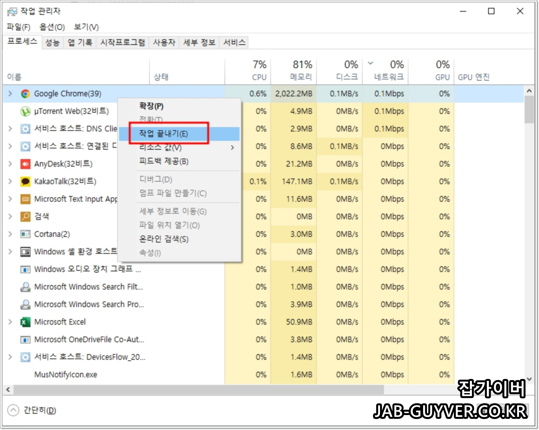 Ctrl + Alt + Del 눌러 작업관리자를 실행하거나 Ctrl + Shift + ESC를 눌러 바로 실행합니다.