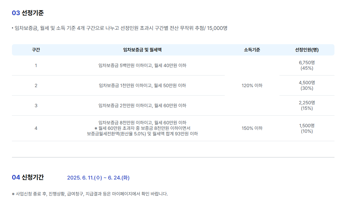 당시 조건은 보증금 5천만 원 이하, 월세 60만 원 이하(보증금 환산 포함 70만 원 이하) 주택에 거주하면서, 청년 가구는 중위소득 60% 이하, 재산 1억 700만 원 이하, 원가구는 중위소득 100% 이하, 재산 3억 8천만 원 이하 등 상대적으로 엄격한 기준이 적용됐습니다.: