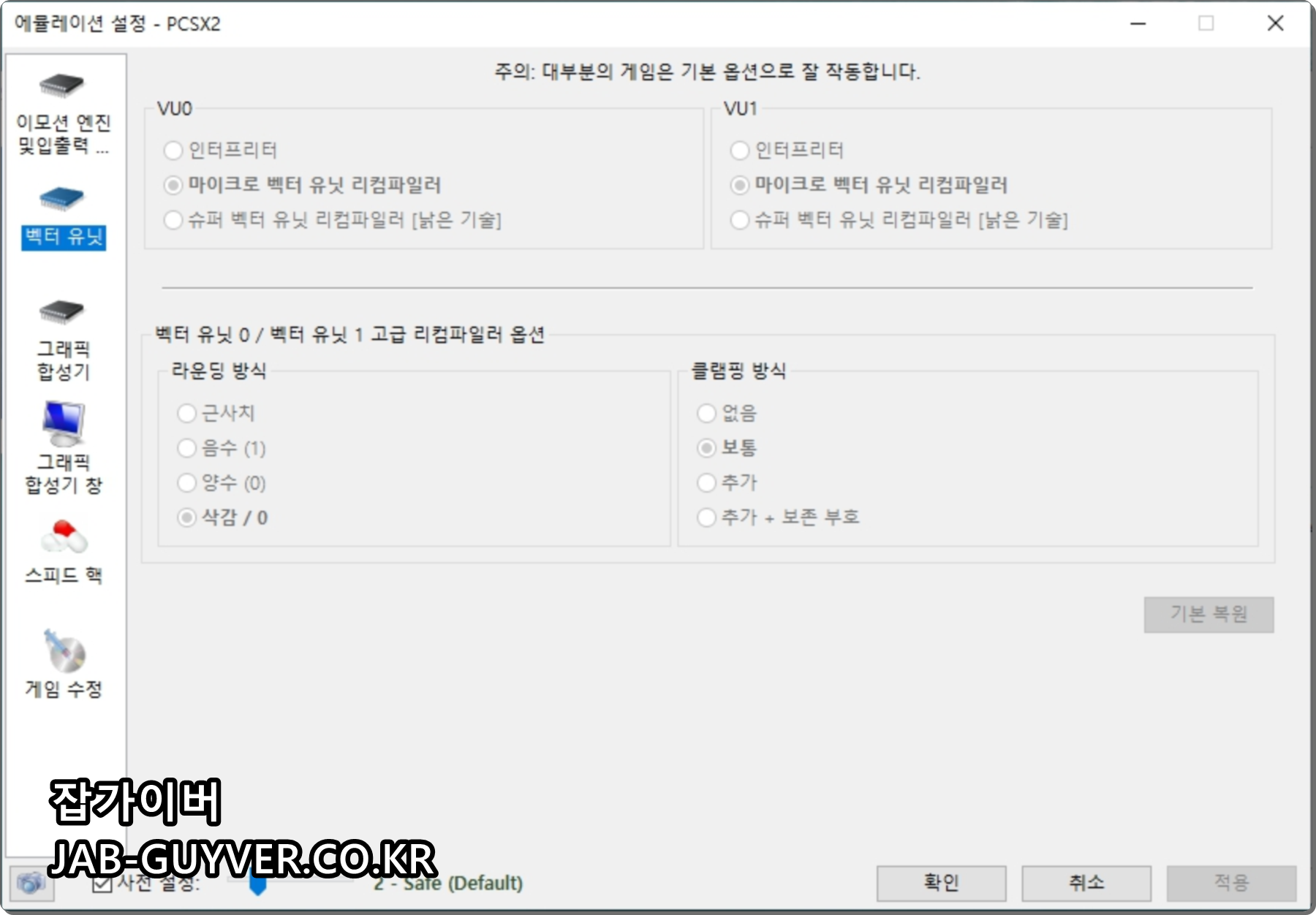 마이크로 벡터 유닛 리컴파일러'는 다른 옵션과 다르게 최신 컴파일러이고 게임과의 호환성이 좋으며 이것도 게임 호환성과 관련되어 있어 기본 설정 그대로 둡니다. '라운딩 방식' 과 '클램핑 방식'은 이모션 엔진/부동 소수점 장치의 연산 속도를 결정합니다.