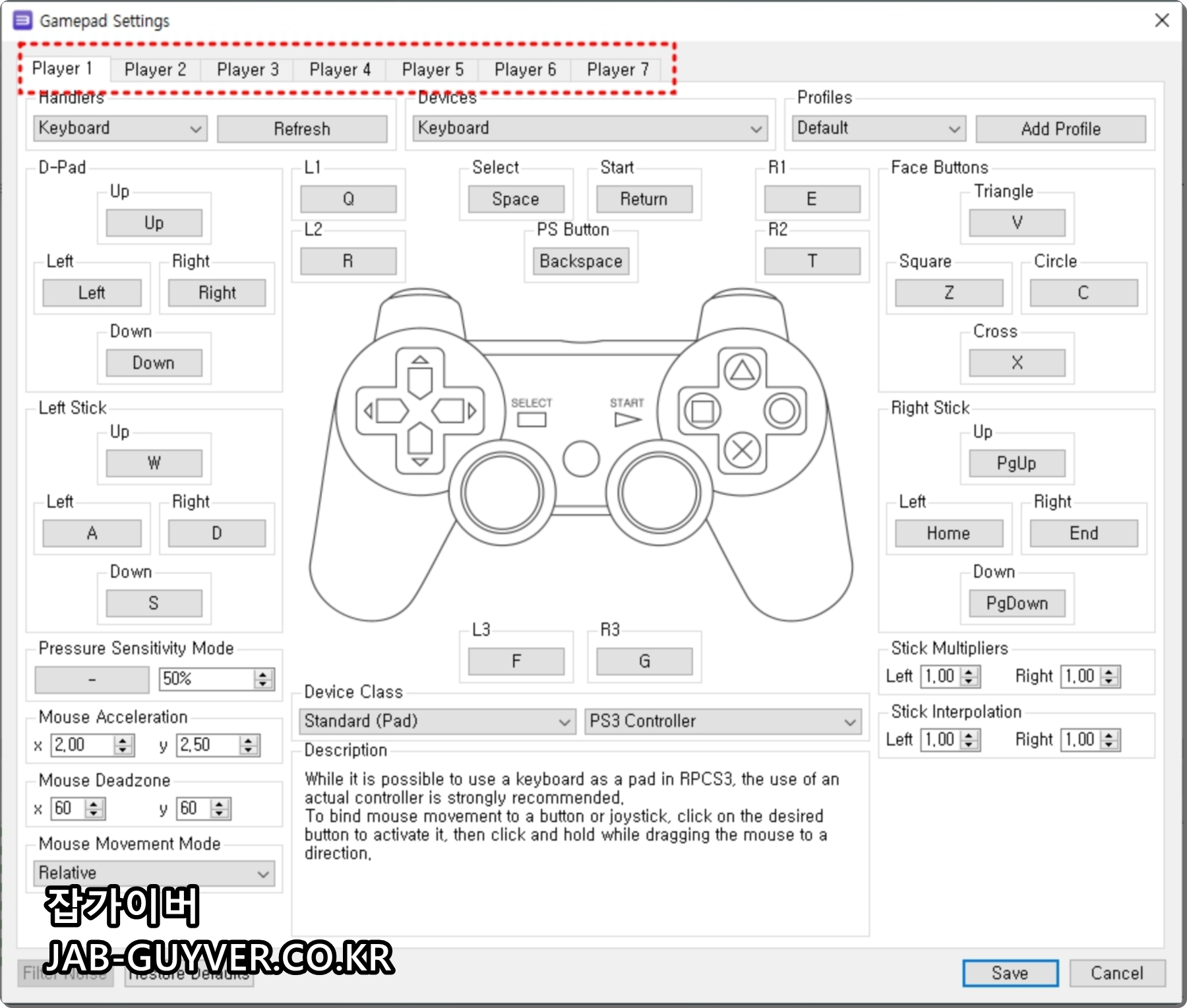 Player1부터 최대 7개까지 게임패드를 설정할 수 있습니다.