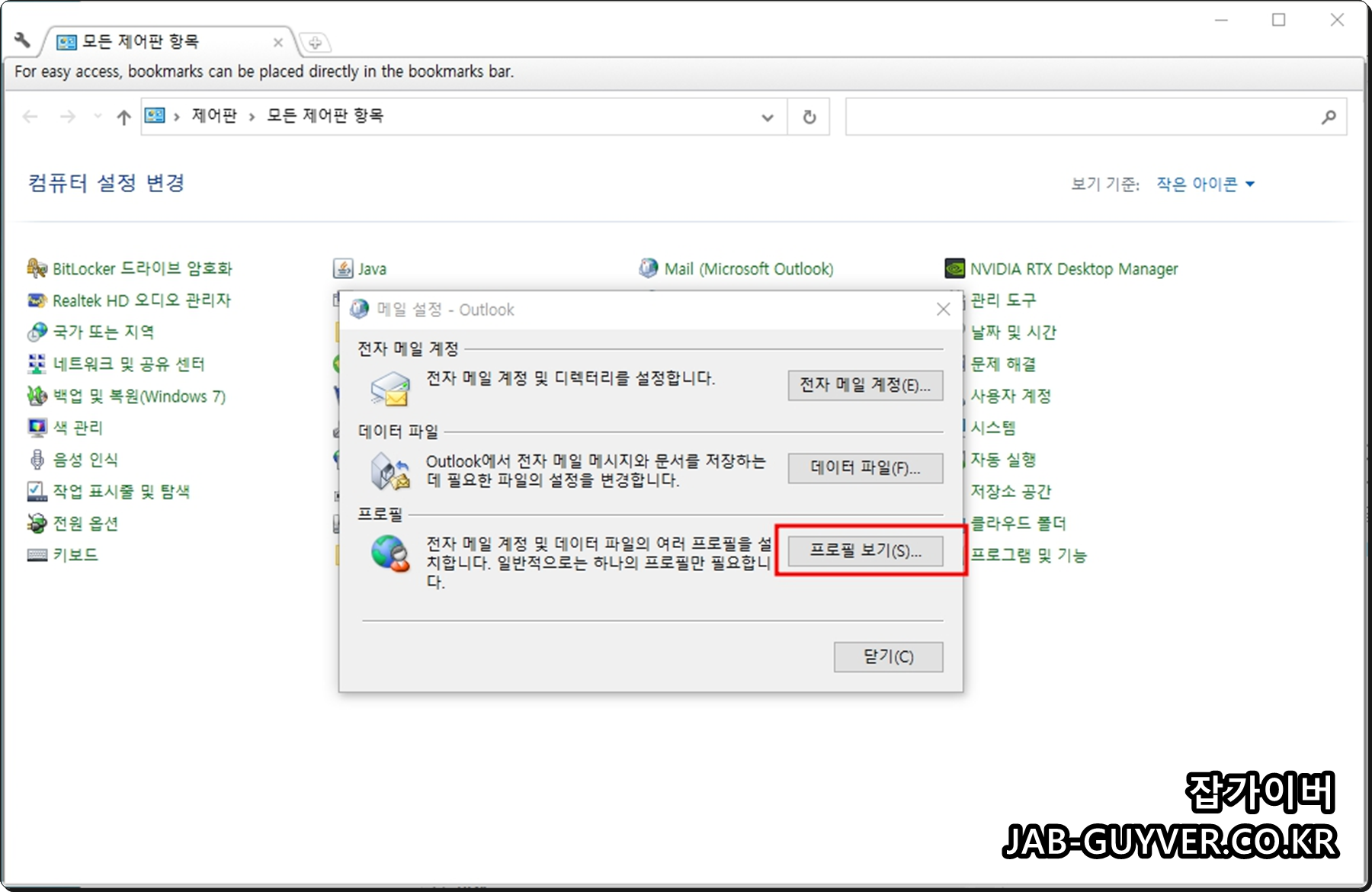 제어판 보기 방식을 ‘큰 아이콘’ 또는 ‘작은 아이콘’으로 변경하면 "Mail (Microsoft Outlook)" 항목이 보입니다.