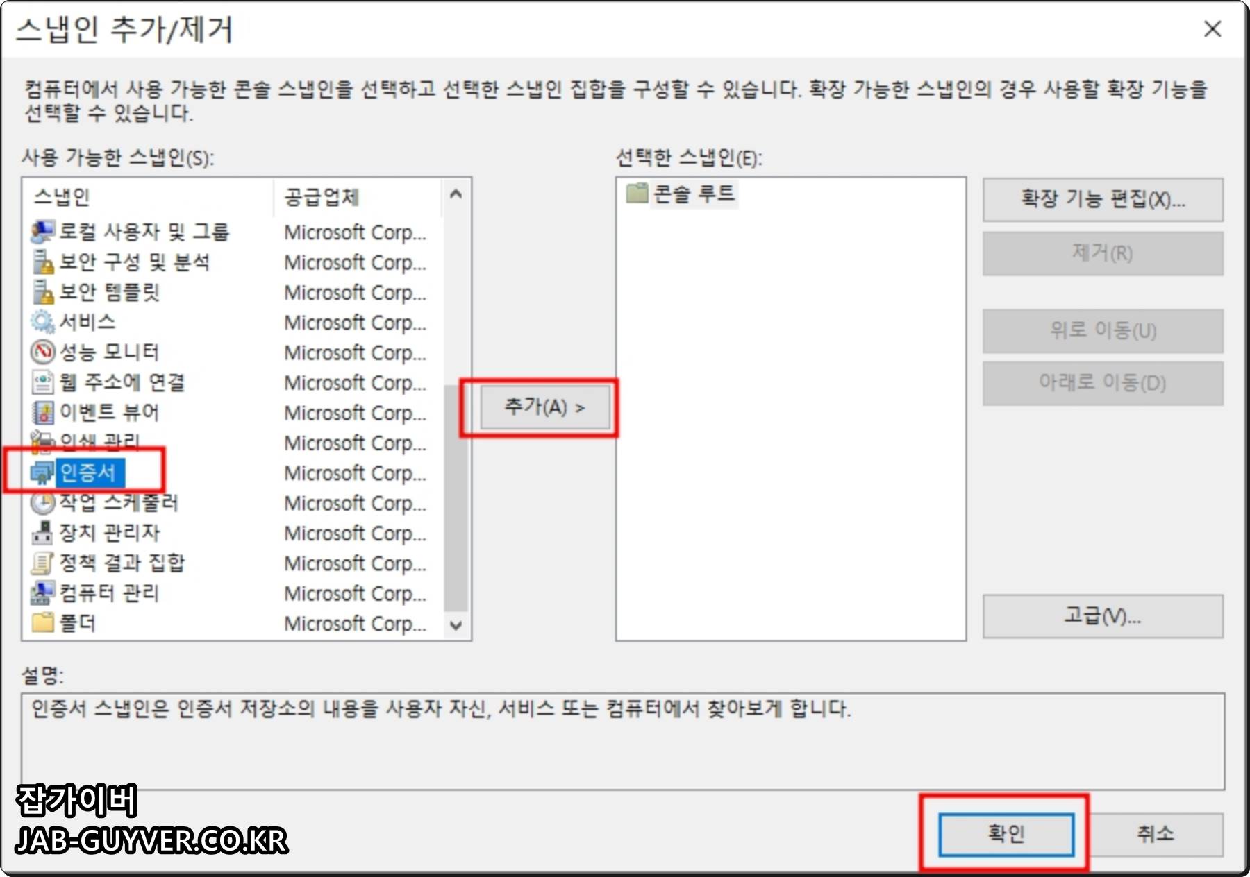 스냅인 추가 / 제거를 눌러 인증서를 추가합니다