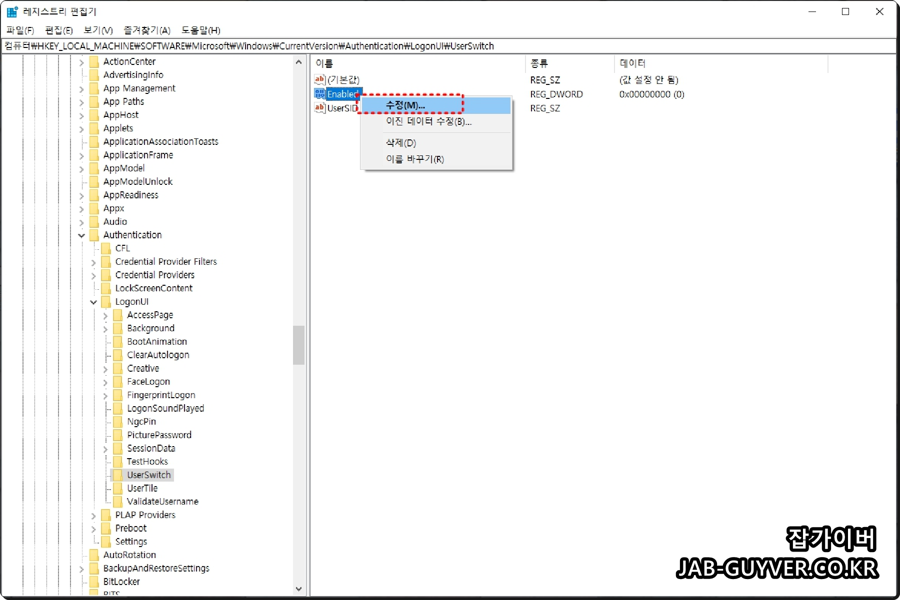 Enable의 값을 0에서 1로 변경 (Enable을 더블 클릭 -> '값 데이터'를 0에서 1로 변경 -> 확인을 눌러줍니다.