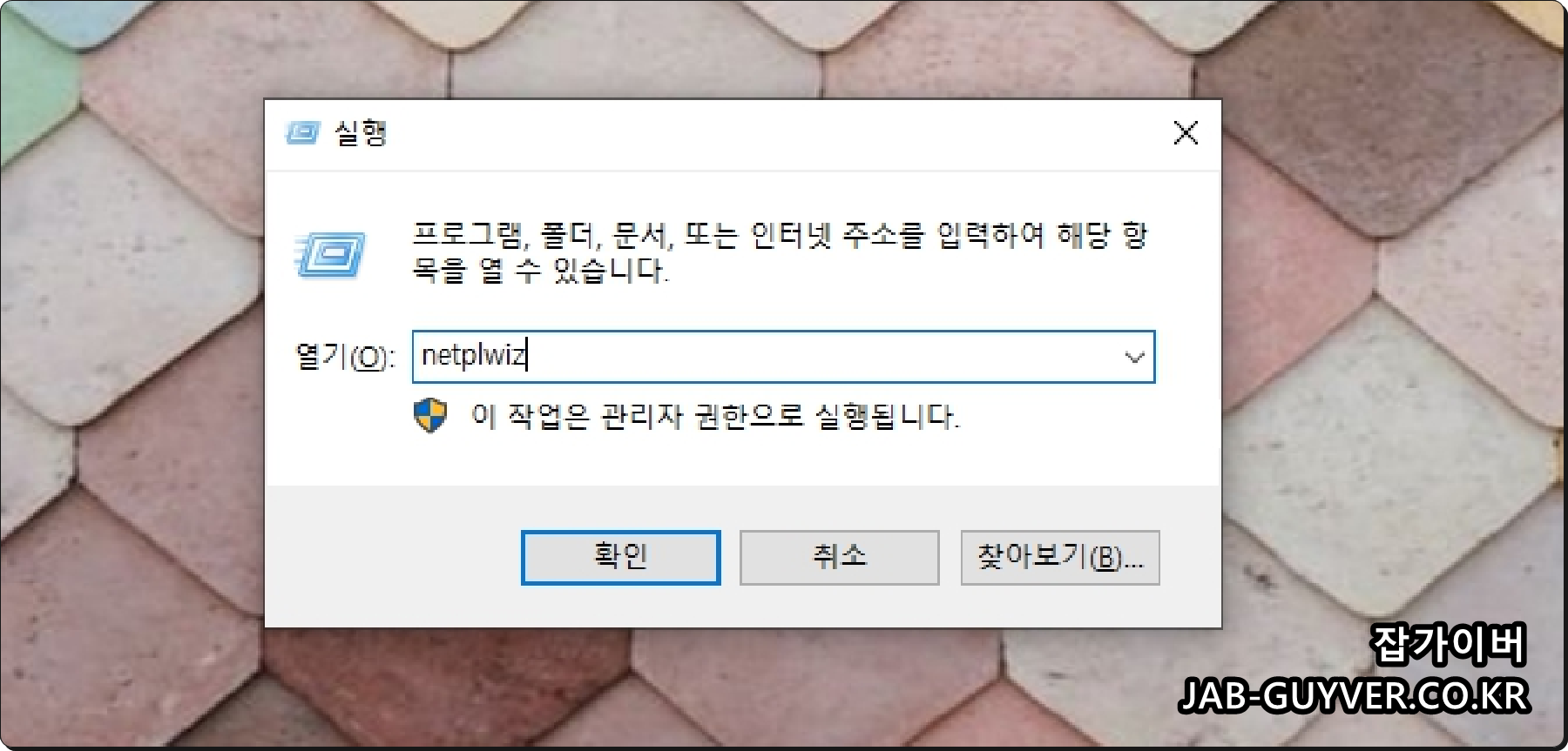 윈도우 키 + R을 눌러 실행창에 Netplwiz 입력 후 확인을 눌러줍니다.