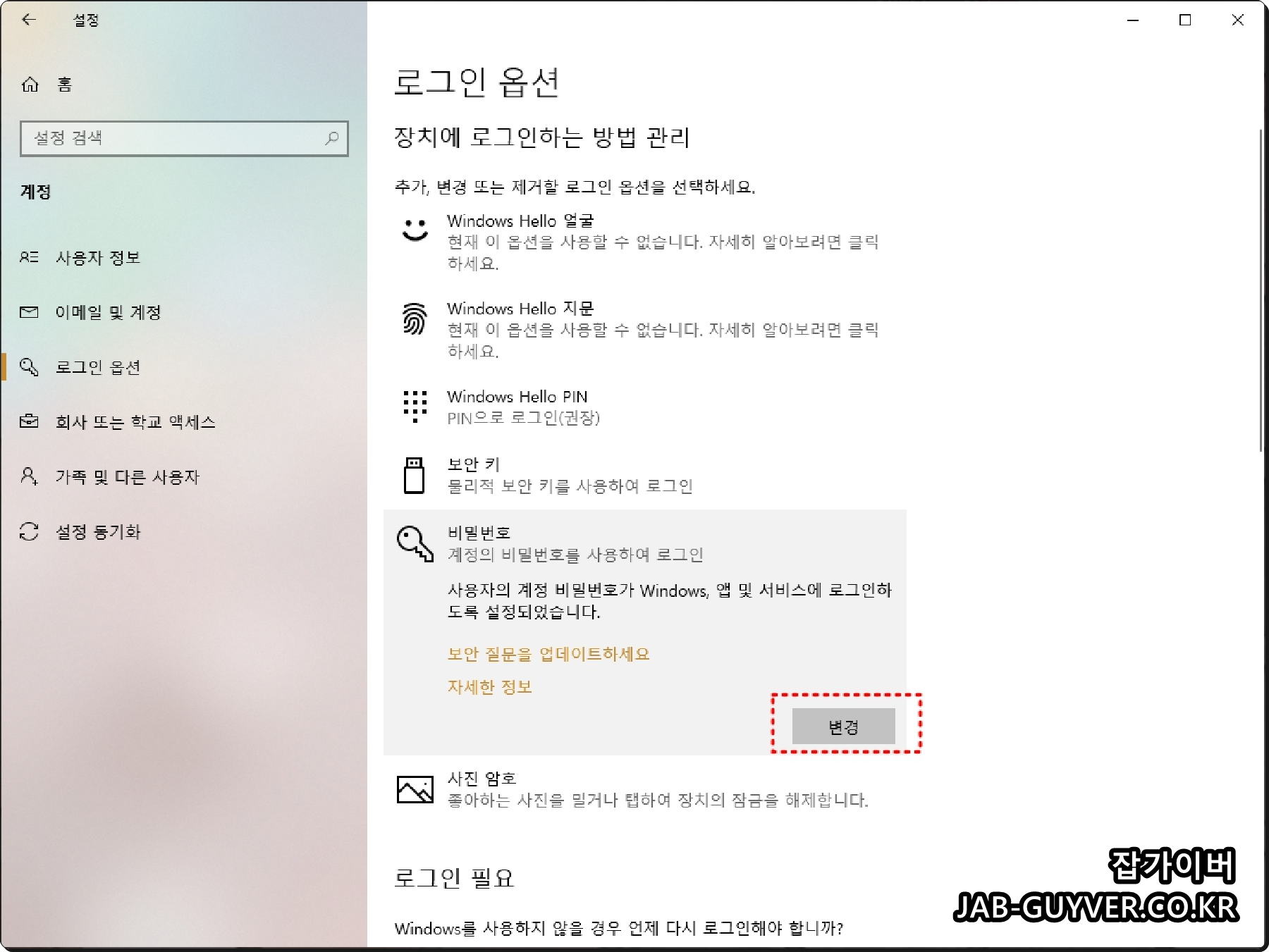 로그인 옵션으로 들어가면 윈도우에서 제공되는 각종 컴퓨터 부팅 시 사용되는 부팅 로그인 보안설정이 있습니다.