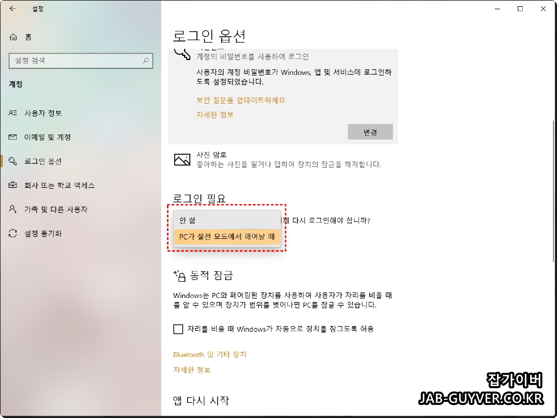 로그인 필요에서 절전모드 해제 시에도 로그인 비밀번호를 입력해야 하는지 보안설정을 할 수 있습니다.