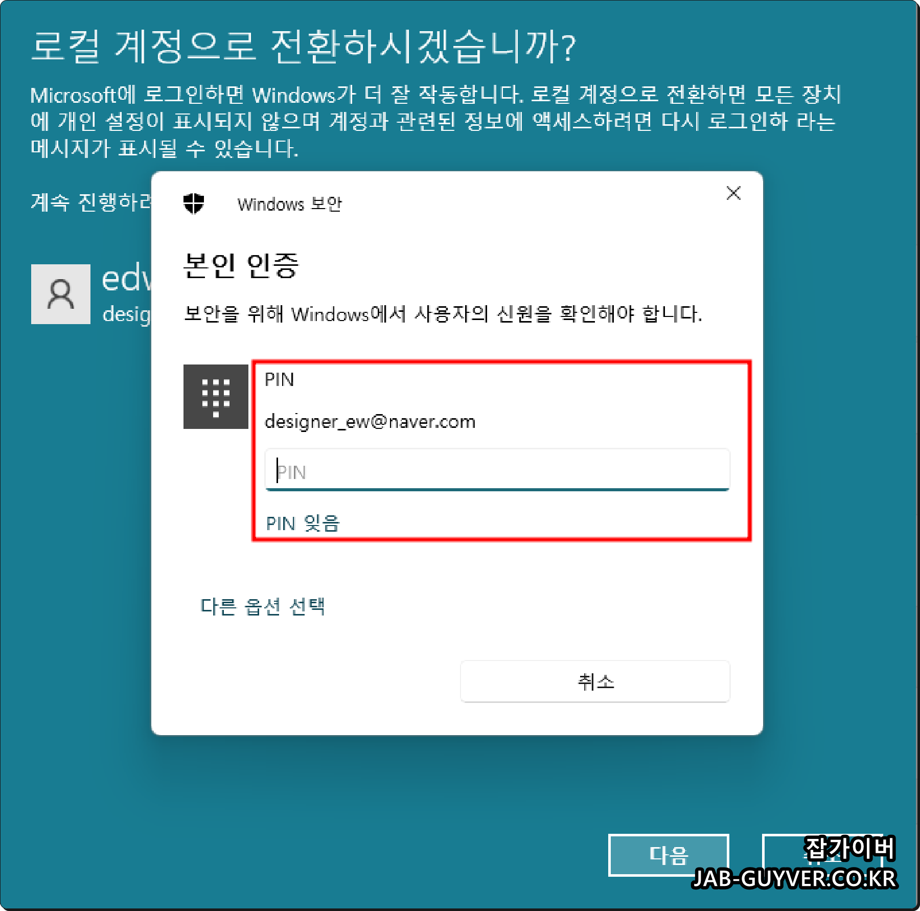 사용자정보에서 "대신 로컬 계정으로 로그인"을 클릭 후 팝업창이 뜨면 다음 버튼을 클릭합니다. 그러면 팝업창으로 본인 인증을 위한 PIN 또는 Microsoft 계정 암호를 입력 후 엔터를 눌러줍니다.
