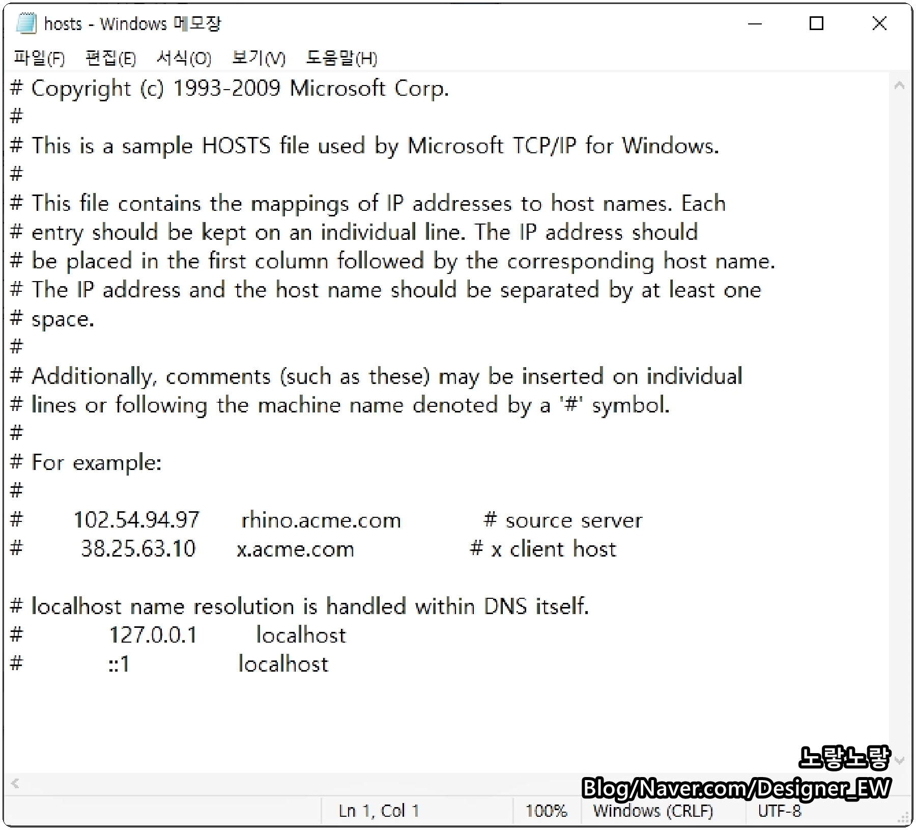만약 HOSTS 파일수정 파일변경 시 읽기 쓰기 권한이 부족해 수정이 안된다면 위 내용을 참고하세요